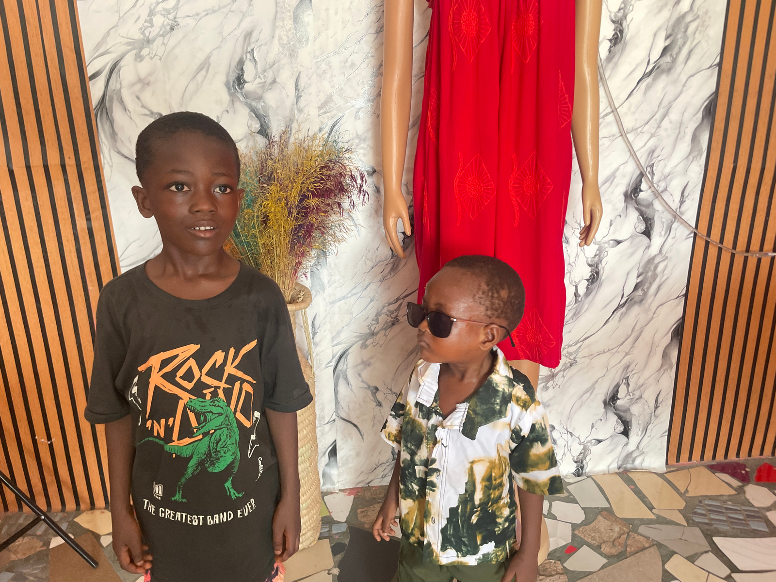 Two people are on the floor. One person wears sunglasses, a white and green button-down shirt, and a red garment. The other person wears a black t-shirt. The scene includes mannequin arms, a bag, and…read more