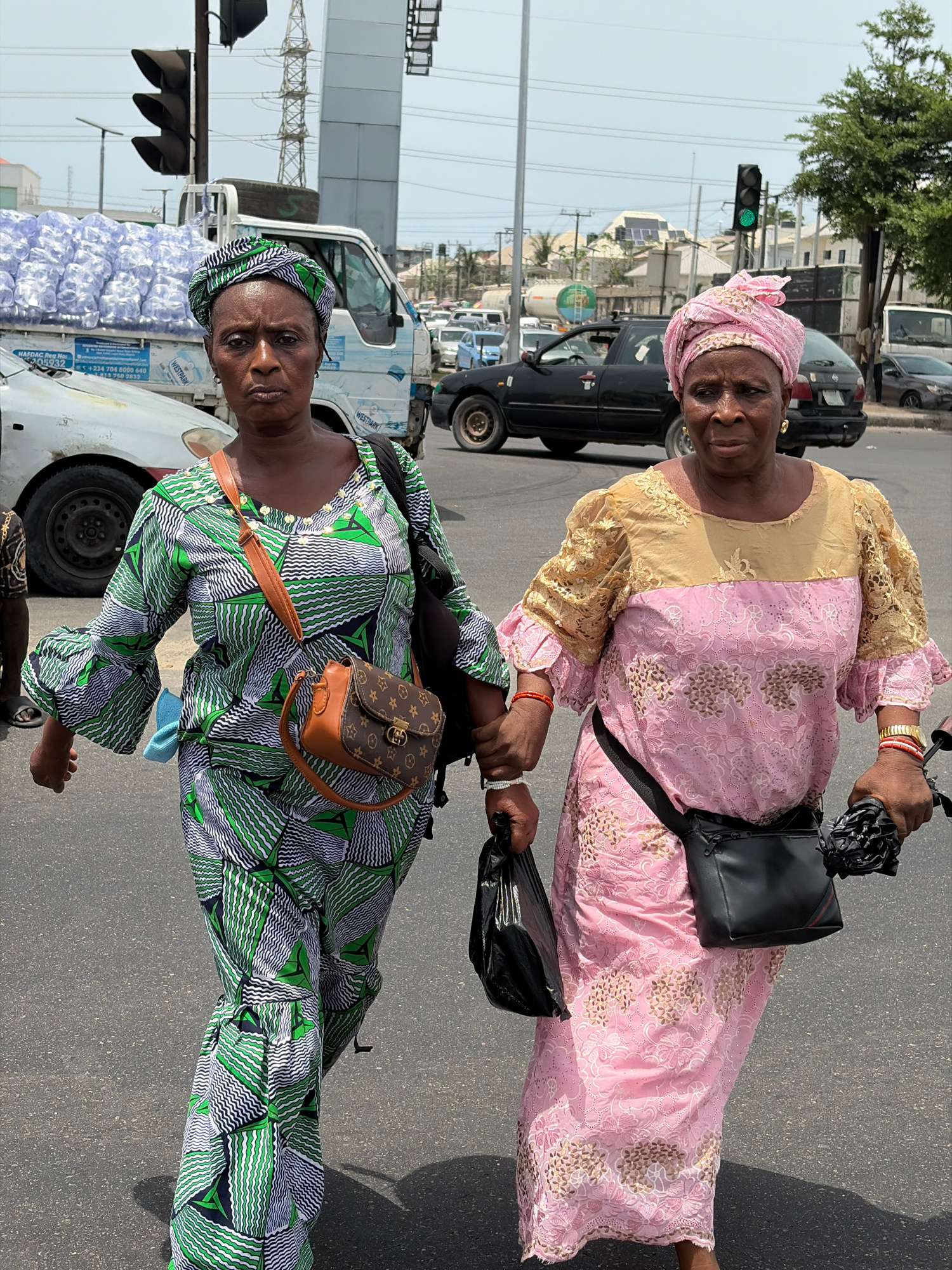 Two women stand on a road in Alaguntan, Nigeria. The woman in the foreground wears a green, white, and black patterned dress and head wrap, along with a brown purse. The woman behind her wears a pink…read more