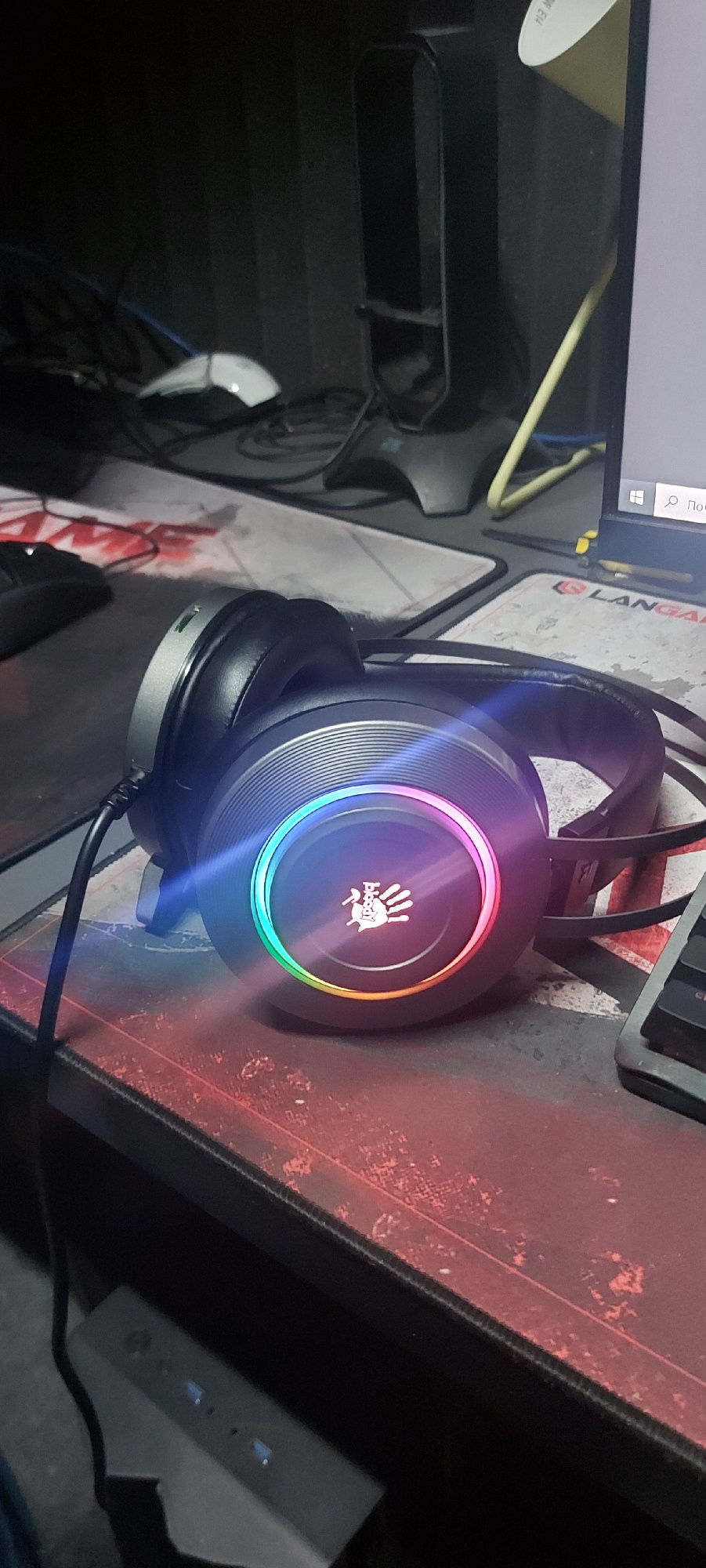 The image shows a headset resting on a mousepad. The headset is black and gray with a circular design on the earcups that features a multicolored LED ring and a white handprint logo with the word "blo…read more