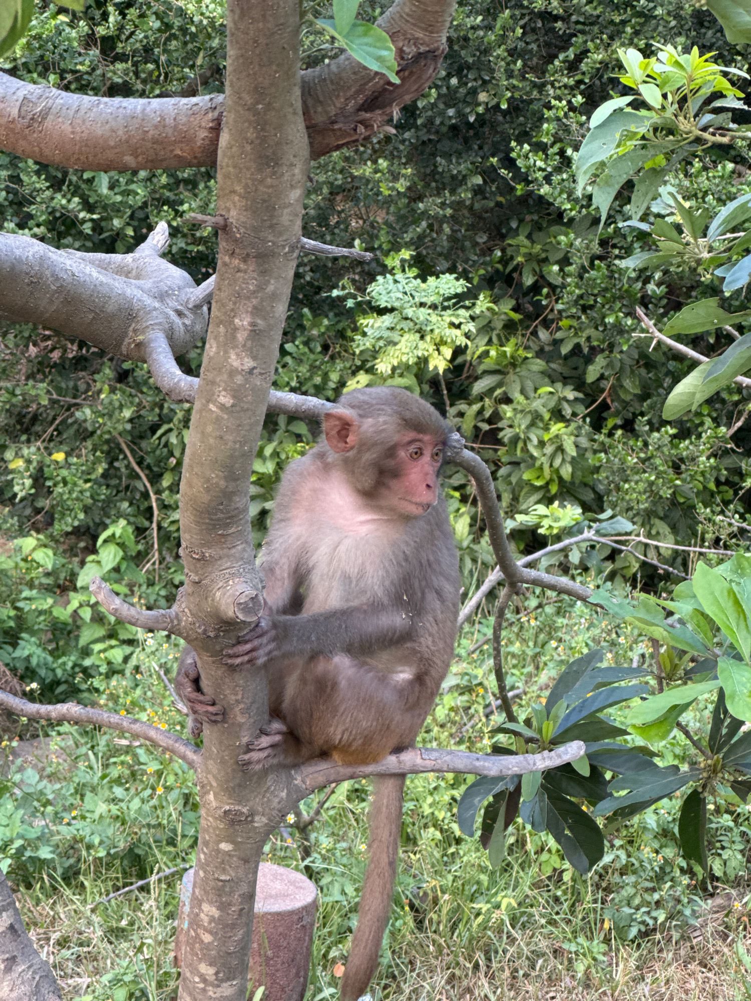 A monkey is perched on a tree branch. The monkey is light brown with a pinkish face. The background consists of green foliage. The location of the scene is not identifiable in the image.