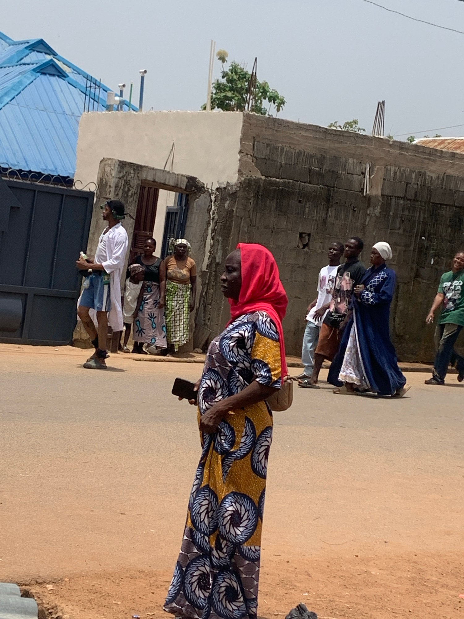 In Akwanga, Nigeria, a group of individuals are walking along a paved road adjacent to buildings. A woman wearing a red head covering and a patterned dress is prominent in the foreground, holding a da…read more