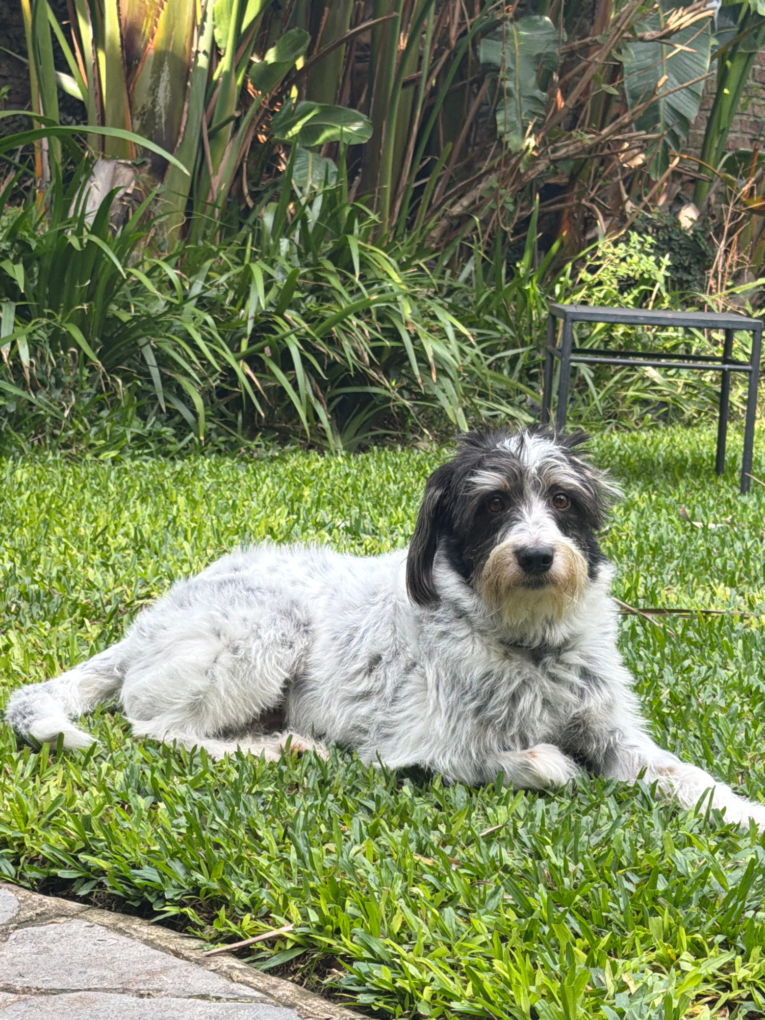 The image shows a medium-sized, furry dog lying on its side in a patch of green grass. The dog has black and white markings, with a predominantly white body and black patches around its eyes and ears.…read more