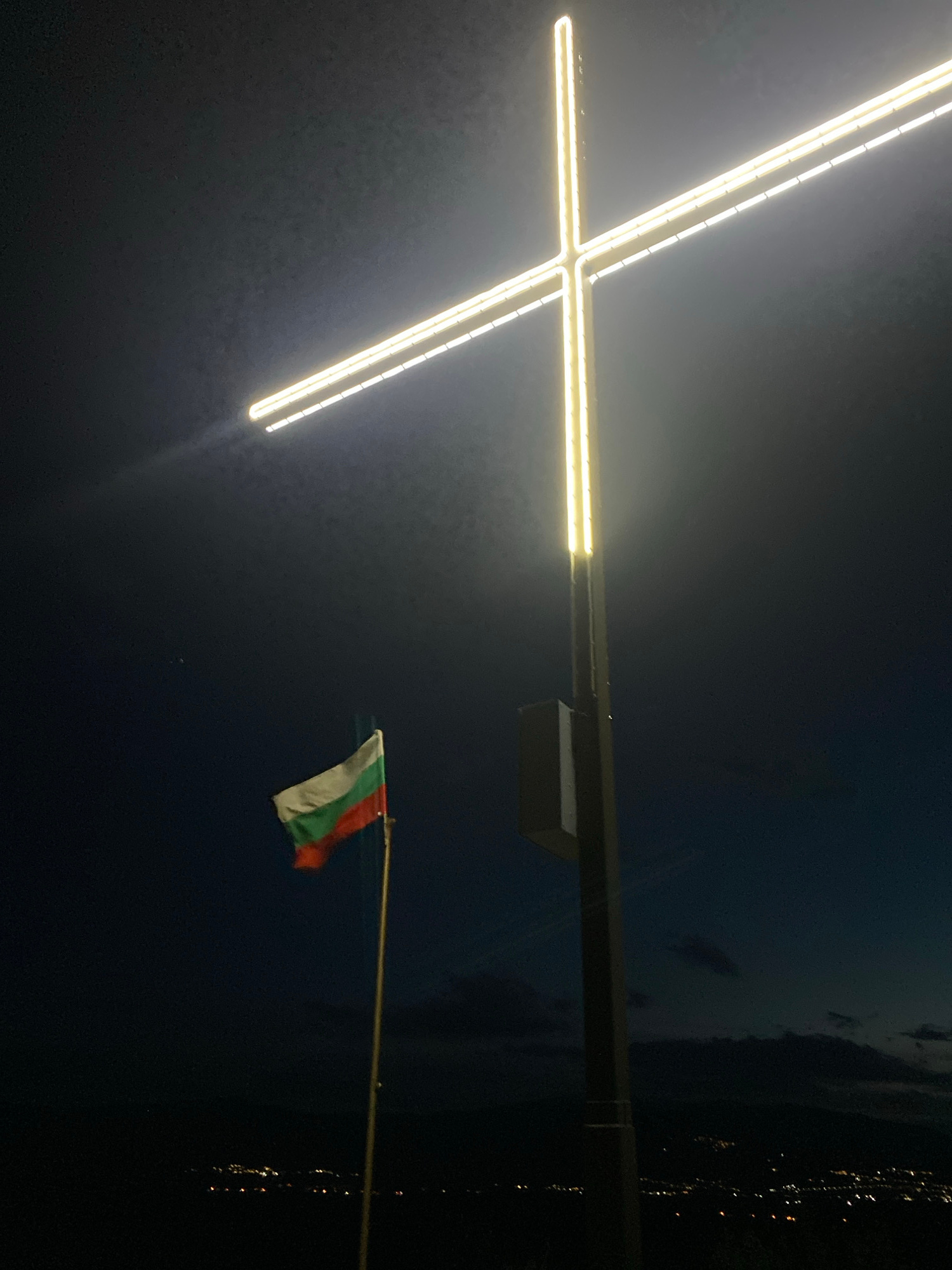 The image shows a night scene in Dolna Grashtitsa, Bulgaria. In the foreground, a brightly lit Christian cross stands atop a post. To the right, a Bulgarian flag is visible, attached to a pole, also i…read more