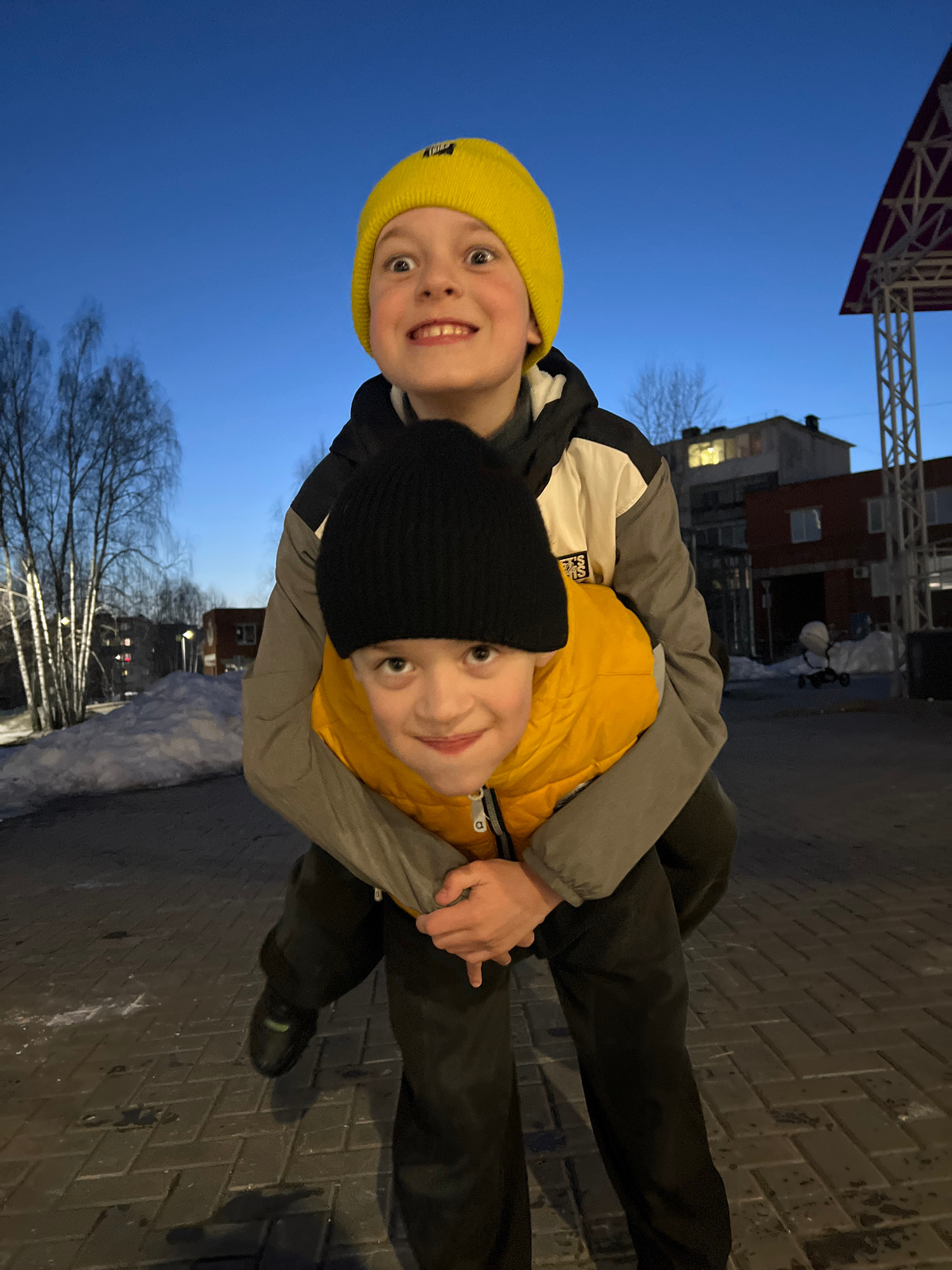 Two young boys are lying on their sides on a brick surface, possibly a sidewalk. One boy wears a yellow beanie, a black and white jacket, and dark pants. The second boy wears a black beanie and a yell…read more