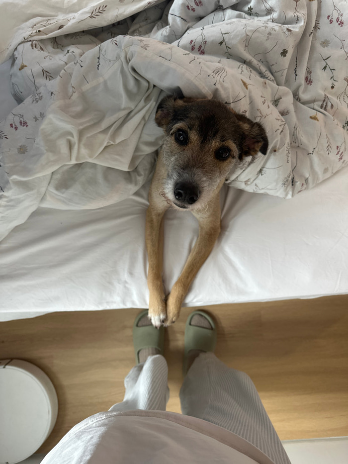 The scene takes place in a residential setting in Batumi, Georgia. A medium-sized dog, exhibiting a scruffy dark brown and tan coat, is positioned on a white bed sheet. Its head is raised above a ligh…read more
