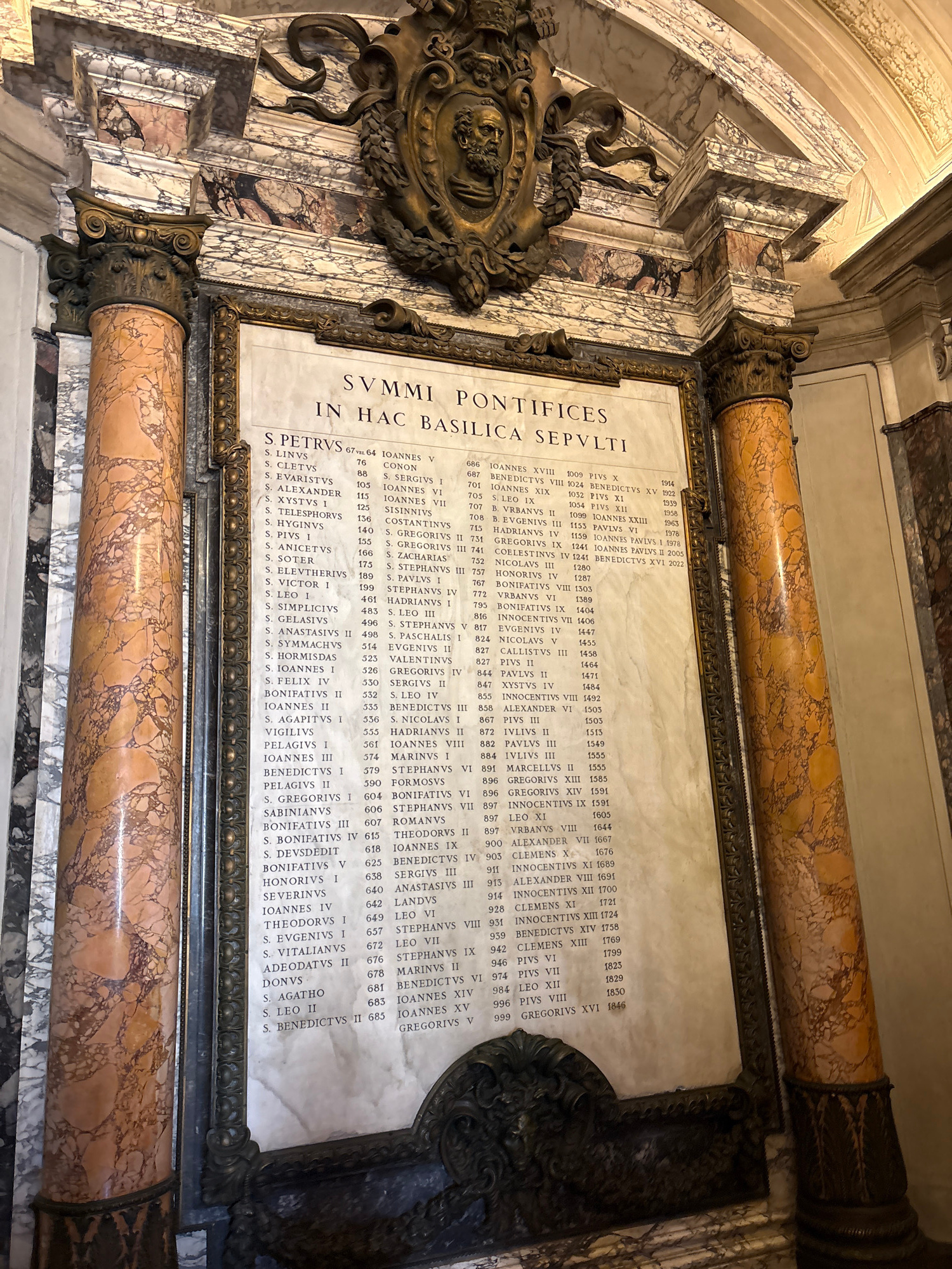 This image showcases an opulent interior architectural detail, likely within a grand basilica or cathedral in Vatican City. The central feature is a large, rectangular marble plaque inscribed with a l…read more