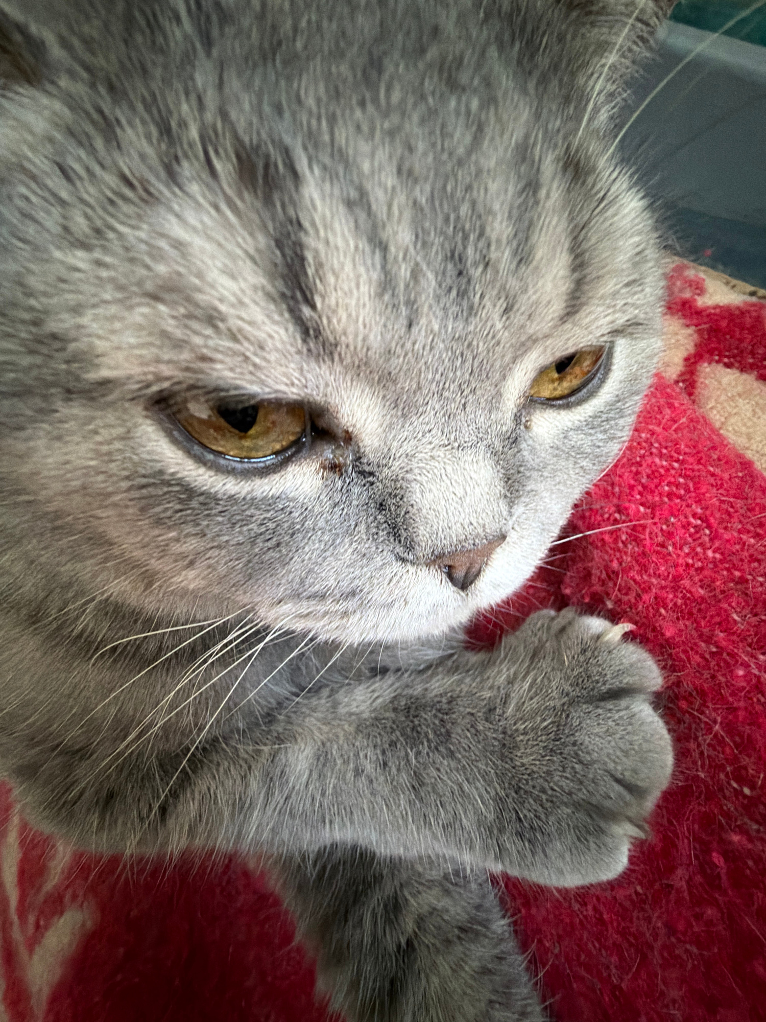 A close-up photograph shows a gray tabby cat lying on a red, textured surface. The cat's face is prominent, with golden eyes visible. One of the cat's paws is raised, with a single claw extended. Theβ¦read more