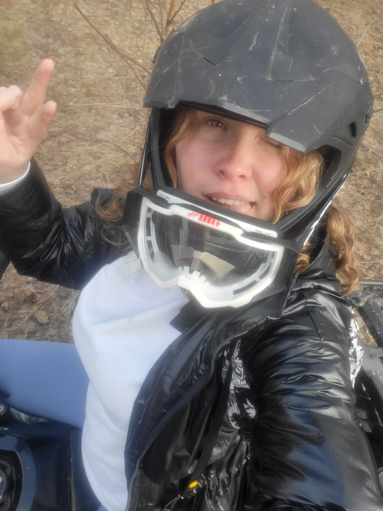 A woman wearing a black helmet and white framed goggles is smiling at the camera. She is wearing a shiny black jacket over a white shirt and light blue pants. She is giving a peace sign. The backgroun…read more