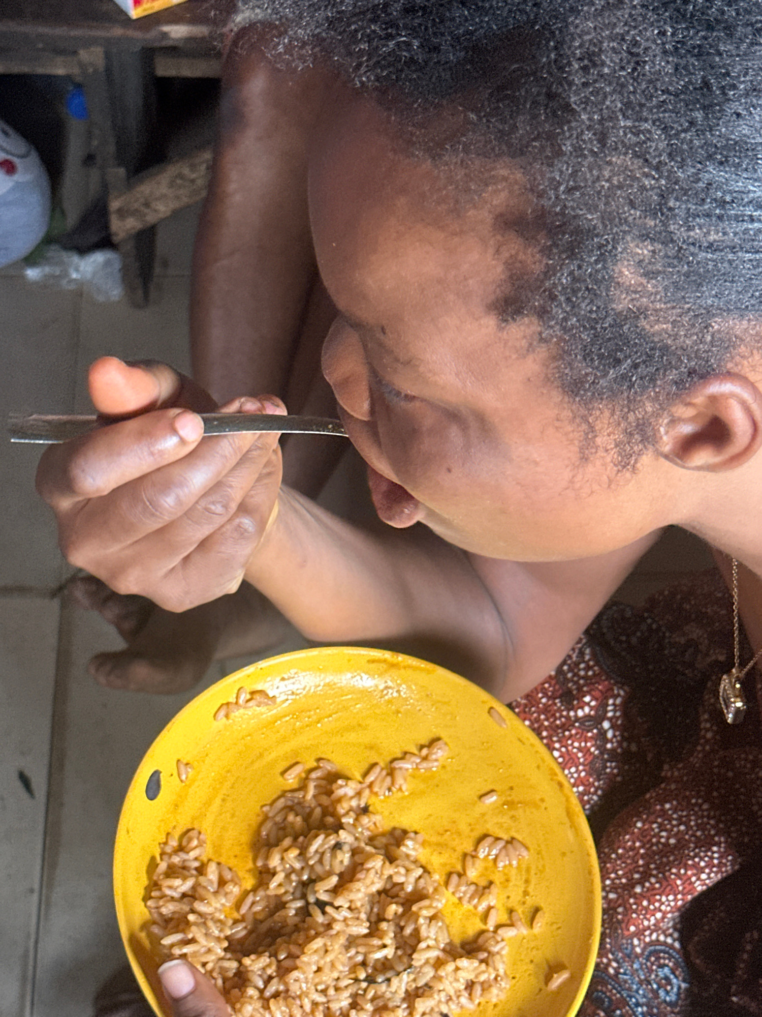 A person with dark skin, curly hair, and a gold necklace is shown eating rice from a yellow plate with a spoon. The individual is seated indoors, possibly in a home in Aba, Nigeria. The environment appears to be dimly lit with basic wooden furniture visible in the background. The plate contains a significant portion of cooked rice, and the individual is in the process of bringing a spoonful to their mouth. Their focus is on the act of eating. A patterned brown, white, and blue cloth is draped over their shoulder. | Open Wire