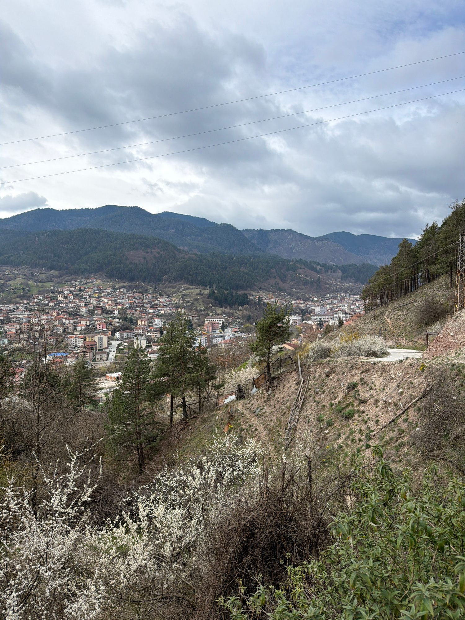 The image captures a view of Devin, Bulgaria, from an elevated position, showing the city nestled in a valley between mountains. The sky is overcast with gray clouds. High-tension power lines stretchβ¦read more