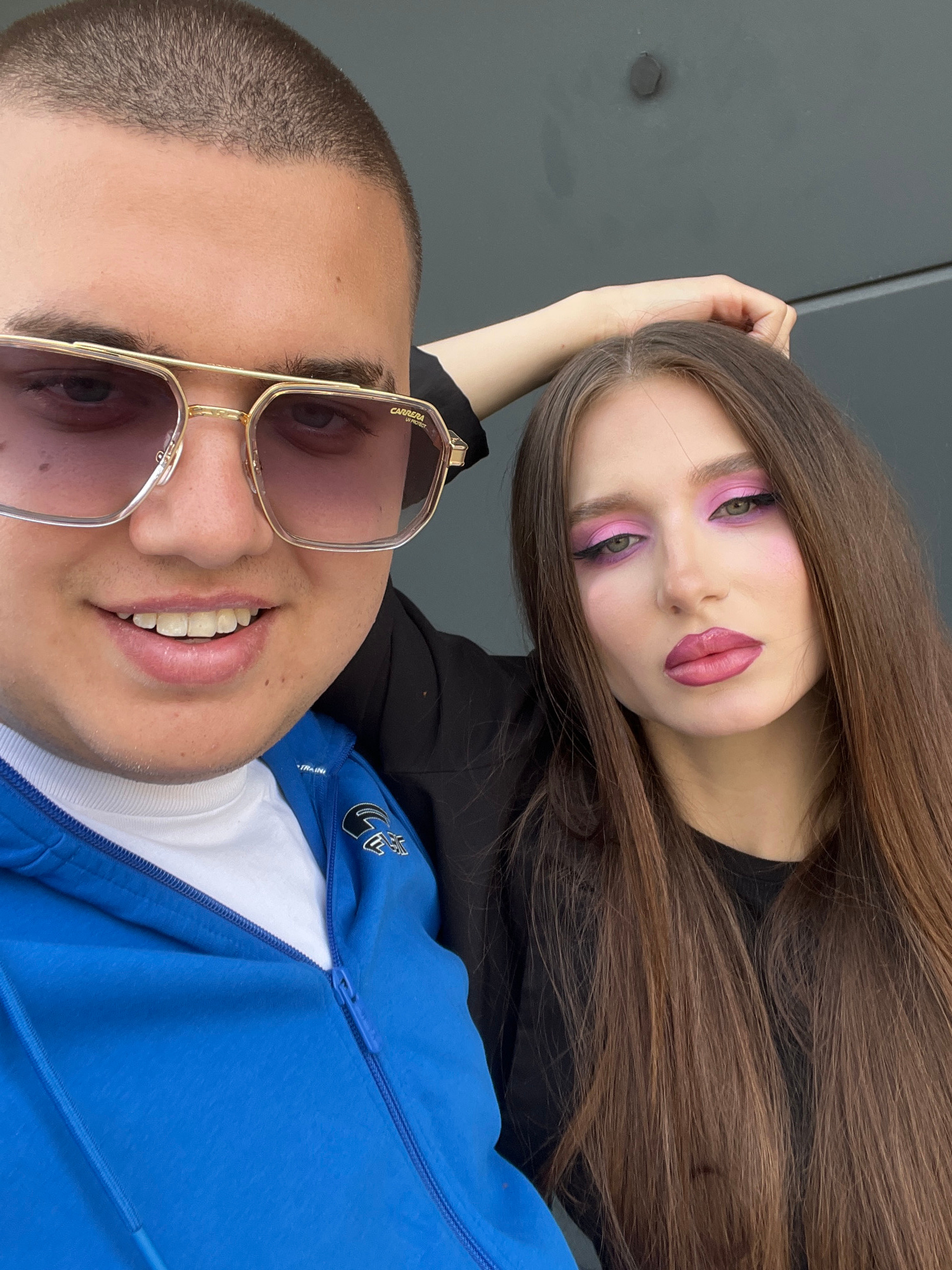 A close-up, selfie-style portrait features two individuals, a woman and a man, against a plain, dark gray background, likely indoors or against a simple wall, located in Ruse, Bulgaria. The image is s…read more