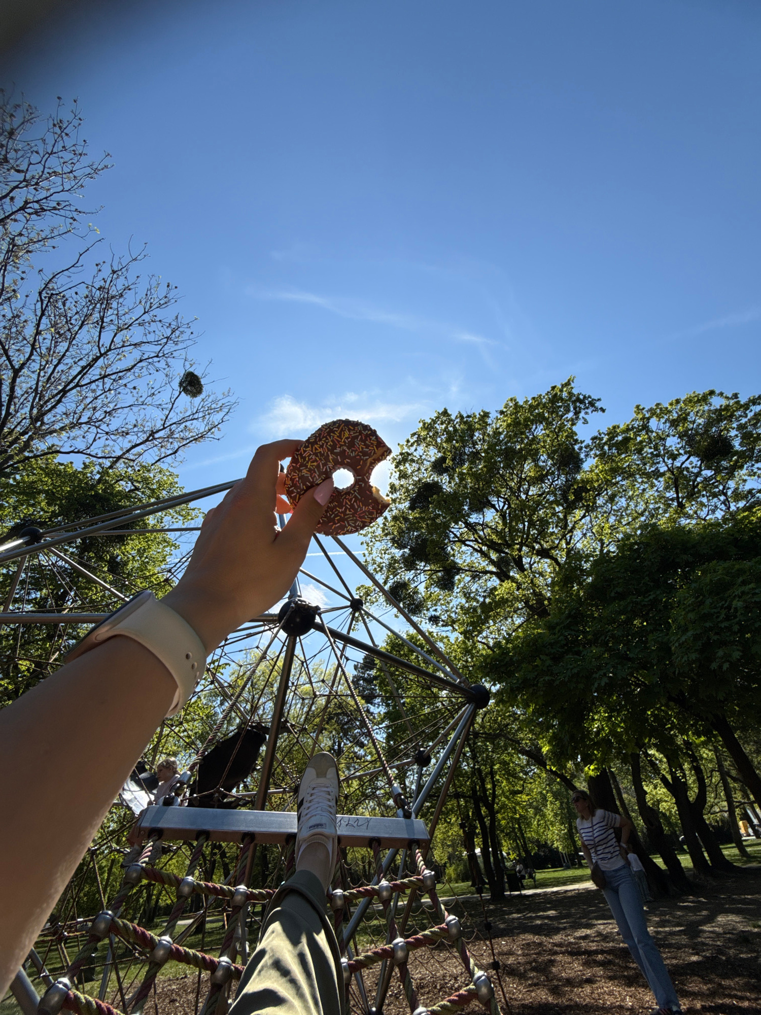 The image, taken outdoors in daylight, shows a low-angle perspective with the camera tilted upwards. The subject is a person holding a bitten chocolate donut with sprinkles in their right hand. They a…read more