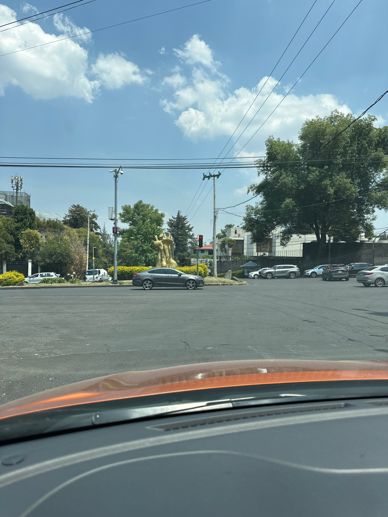 The image displays a daytime street scene, likely from the perspective of someone inside a vehicle, given the visible orange-brown car trim in the foreground on the right. The sky, occupying the upper…read more