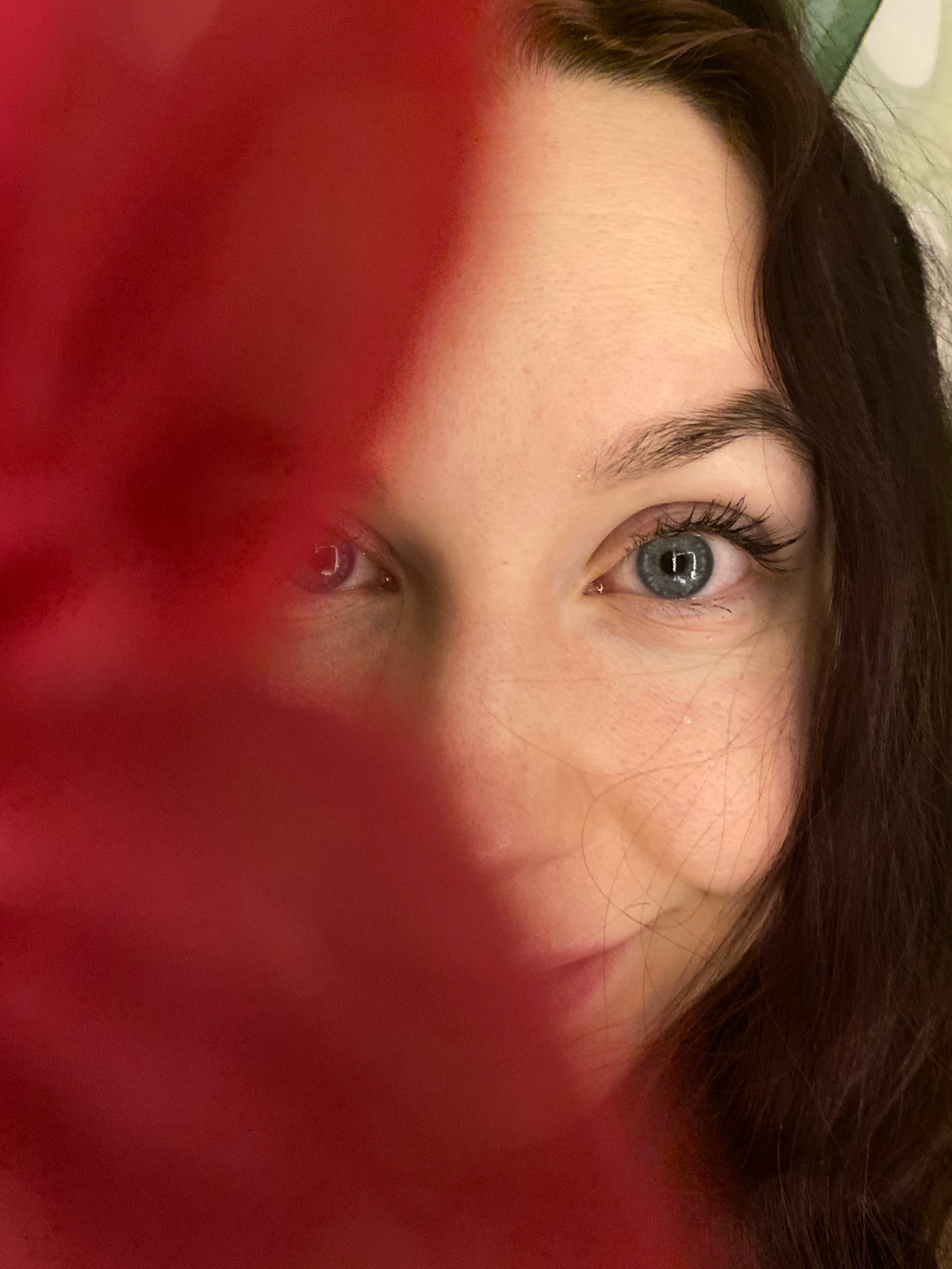 A close-up, high-angle shot captures a person's face, possibly taken in Chaikovsky, Russia. The individual, appearing to be female, has dark brown hair that frames the upper part of her face. Her fair…read more