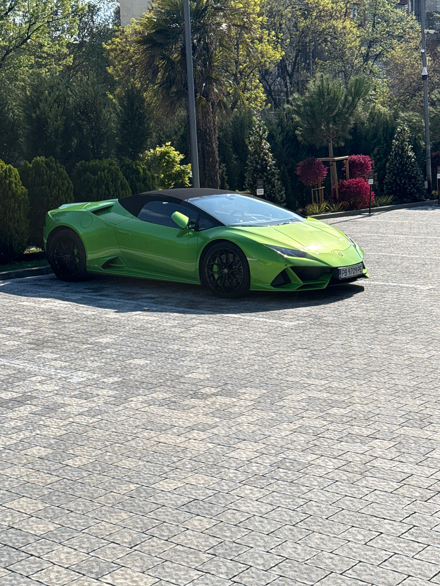 A vibrant, bright green convertible Lamborghini sports car is the central subject of this image, parked on a patterned paved surface under bright daylight. The car is seen from a slightly elevated sid…read more