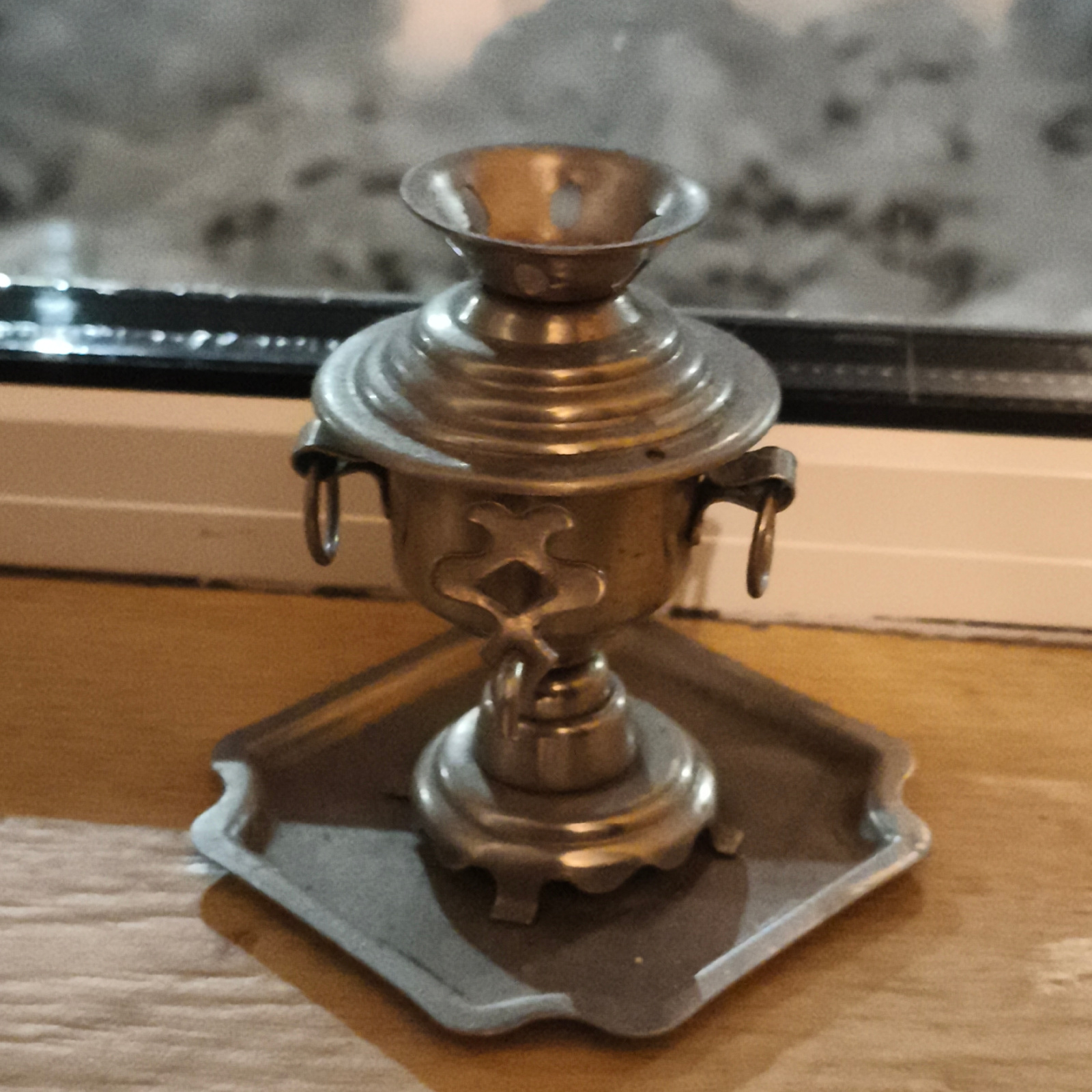 A miniature metal samovar sits on a small, square metal tray with decorative edges. The samovar is tarnished and likely made of a silver-colored alloy. It features a bulbous body with decorative handl…read more