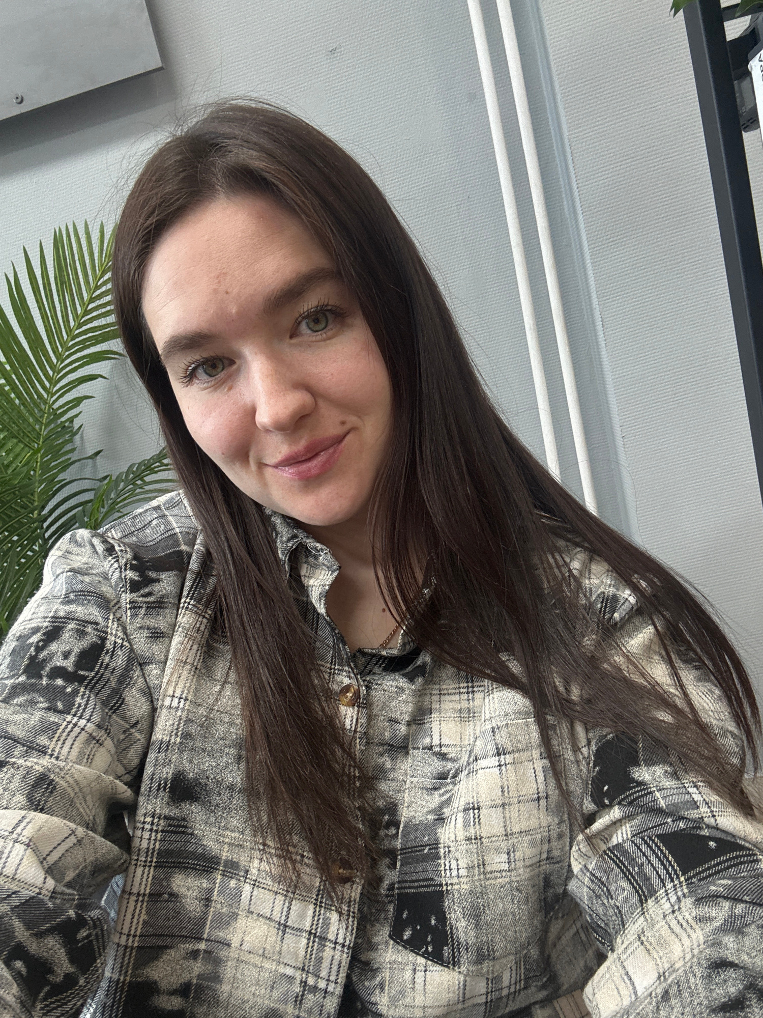 The image shows a young woman taking a selfie in an indoor setting. She has long, straight dark brown hair and green or hazel eyes, looking directly at the camera with a gentle, friendly smile. She is…read more