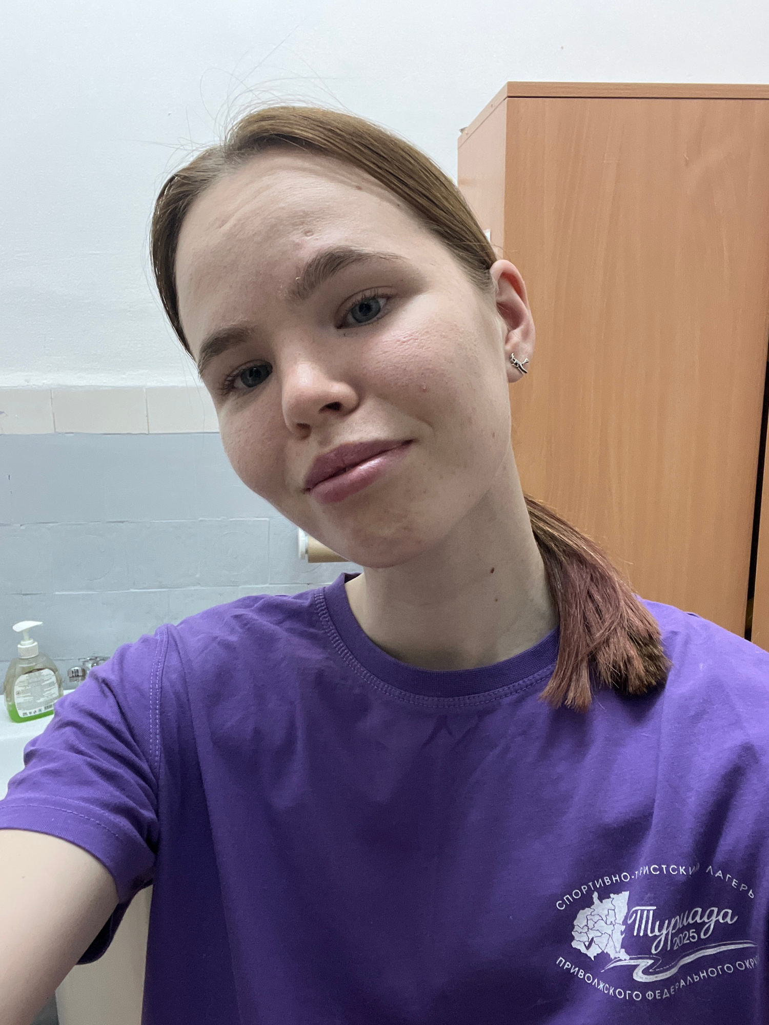 A fair-skinned person with blue eyes and light brown hair pulled back into a ponytail is indoors, facing the camera. They are wearing a purple t-shirt with Russian text and a logo. Behind the person i…read more