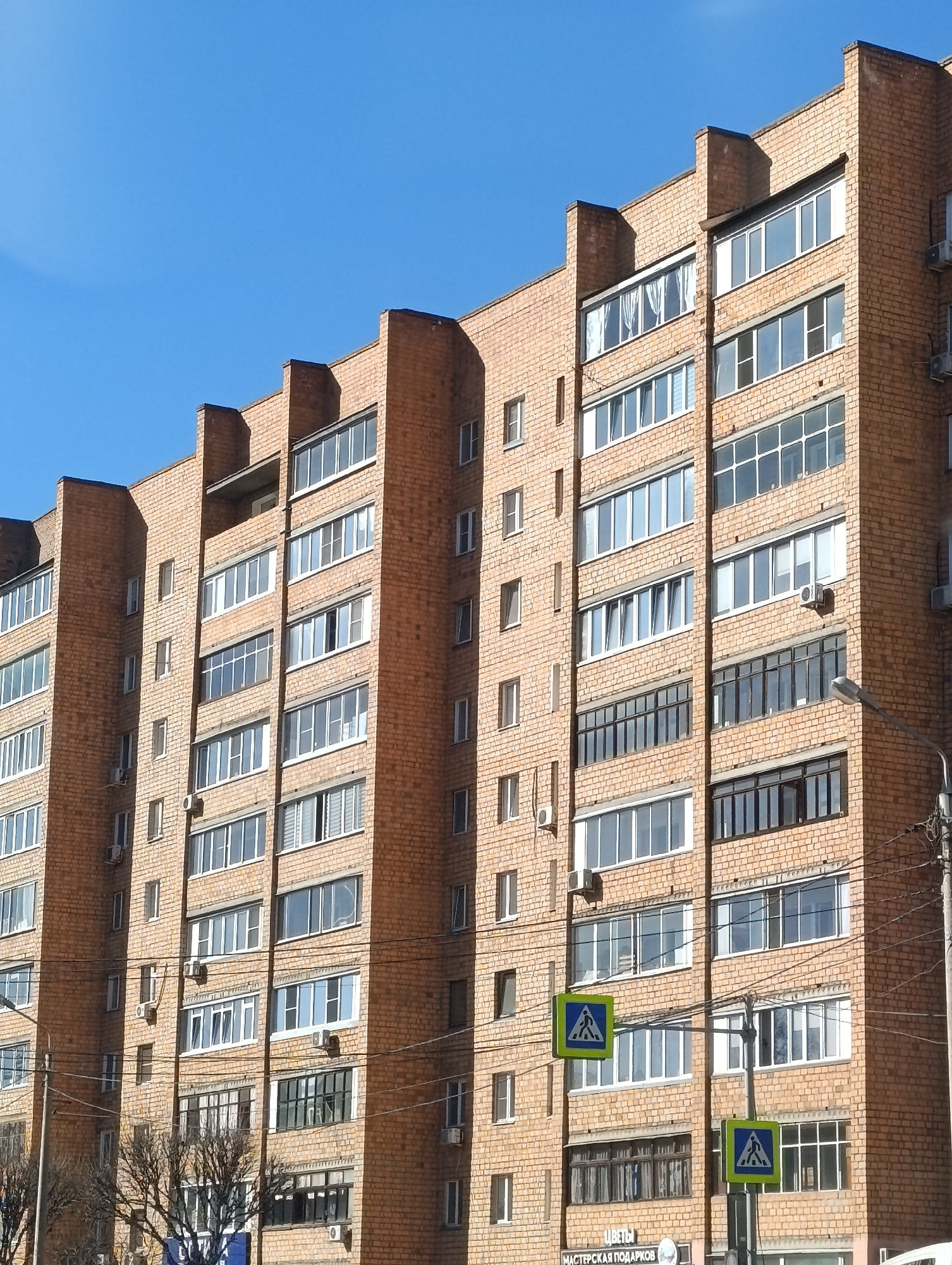 The image shows an orange brick apartment building in Krasnoyarsk, Russia, under a clear blue sky. The building has multiple floors with numerous windows, some of which have air conditioning units att…read more