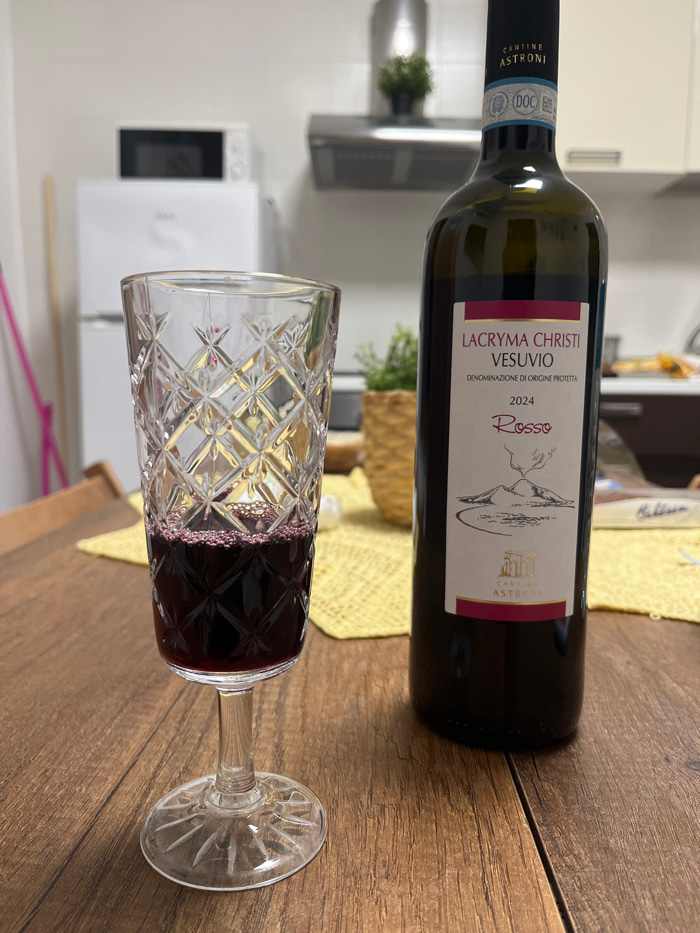 The image displays a still life captured within a residential kitchen in Ercolano, Italy. On a wooden table, a stemmed glass, exhibiting a diamond-cut pattern on its bowl and base, contains dark red w…read more