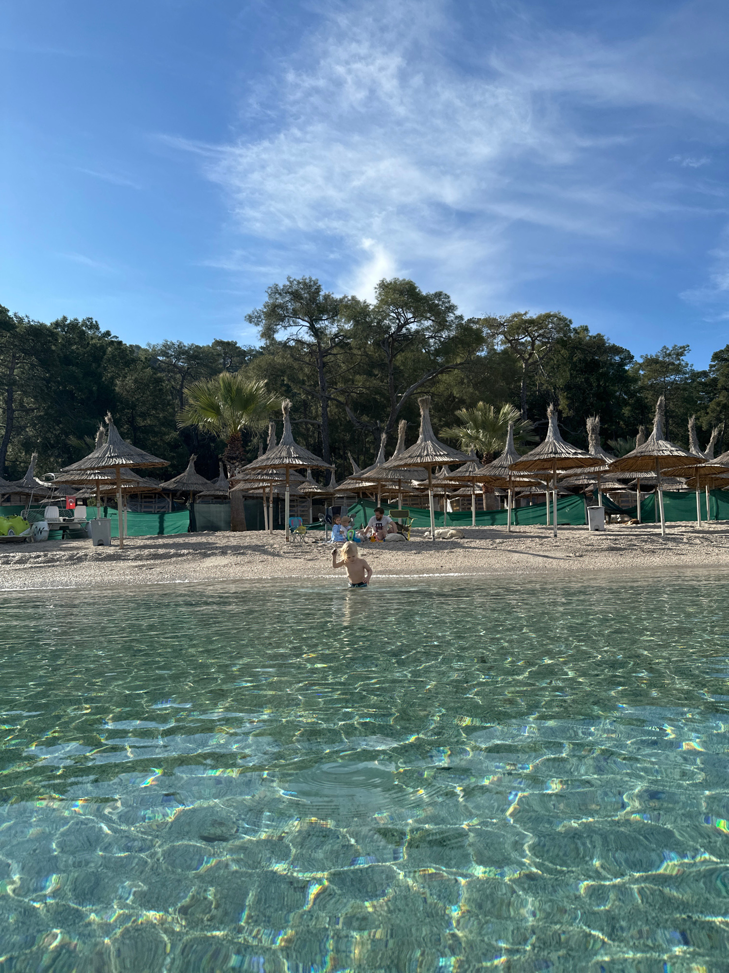 The image depicts a beach scene in Unknown, Türkiye. The scene is oriented with the beach running vertically. Along the left side of the image is a sandy beach lined with thatched umbrellas and beach chairs. Trees and vegetation border the beach, reaching the sky. In the center-right of the image, a boy stands at the edge of the water, partially submerged. The water is clear and reflects sunlight, creating patterns of light and shadow. Above the trees, a blue sky is visible with wispy clouds. The overall impression is of a sunny day at a beach resort. | Open Wire