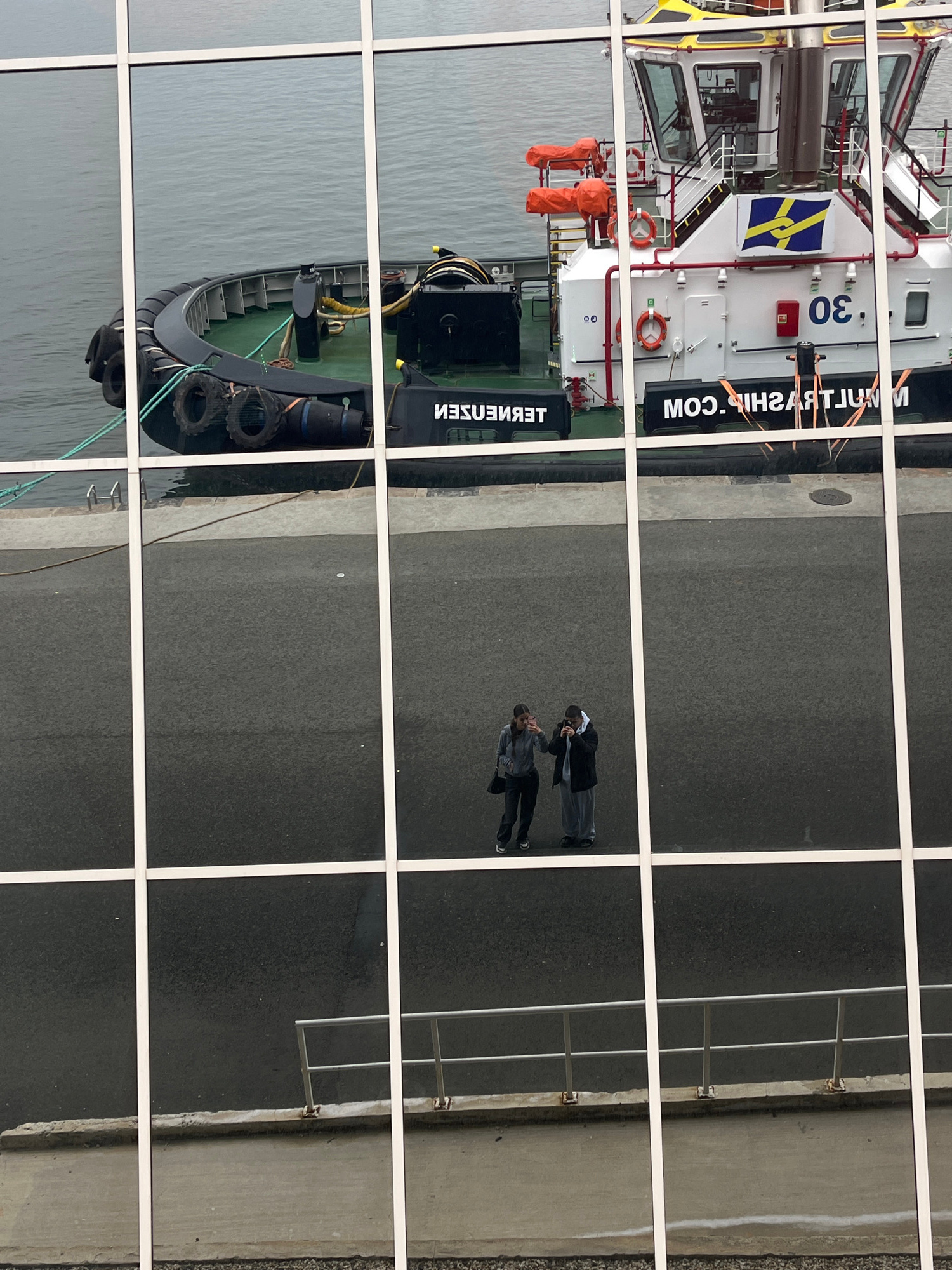 The image shows a reflection in a building's window. The reflection includes a section of the exterior: a tugboat docked in the water next to a concrete pier, and two people standing on the pier, one…read more