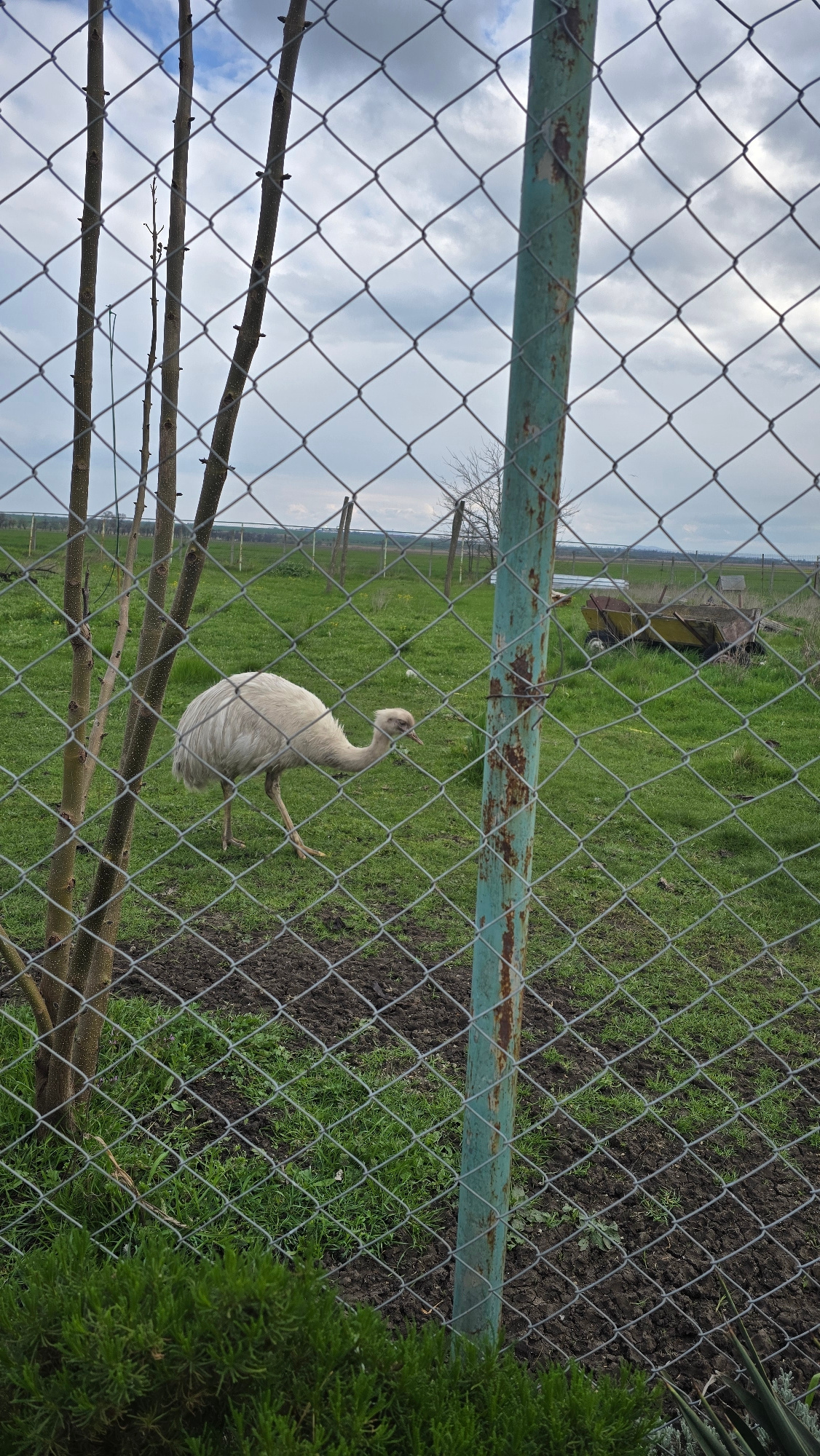A sideways, ground-level shot through a chain-link fence shows a pale rhea walking on grass. The location is Burgas, Bulgaria. A green metal support beam runs horizontally across the upper-left of theβ¦read more