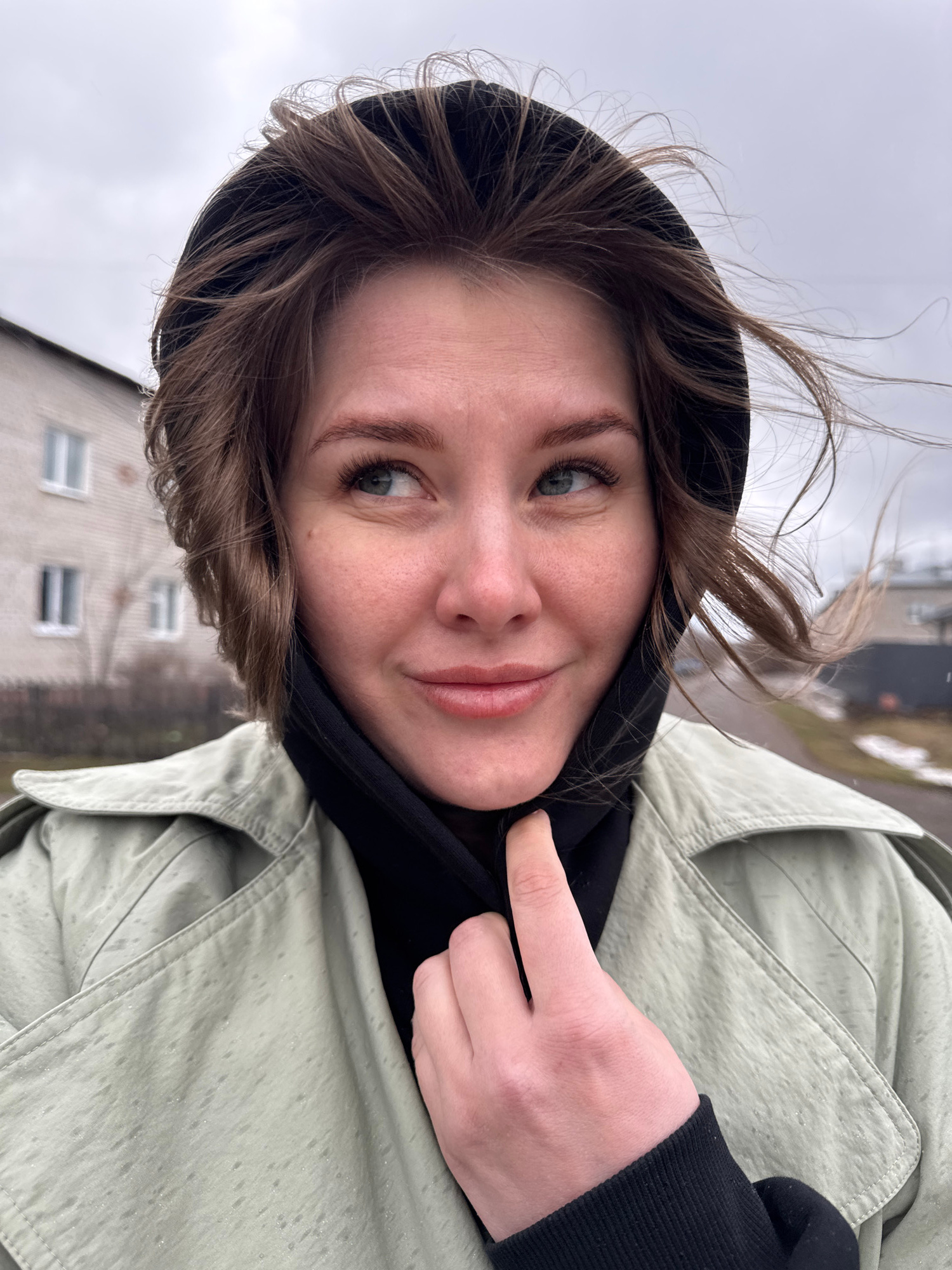 The photograph is a selfie of a light-skinned young woman with light brown hair and blue eyes. Her hair is windblown and partially covered by a black hood. She is wearing a light green trench coat and…read more