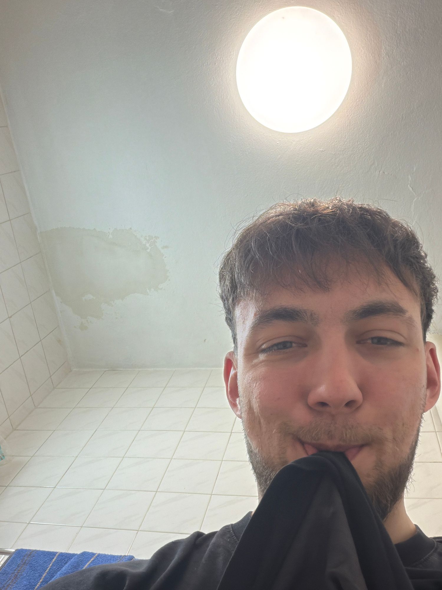 A man is taking a selfie in a bathroom. The bathroom has white tiles on the walls and floor, and a white ceiling with a round ceiling light and a water stain. The image does not provide enough informa…read more