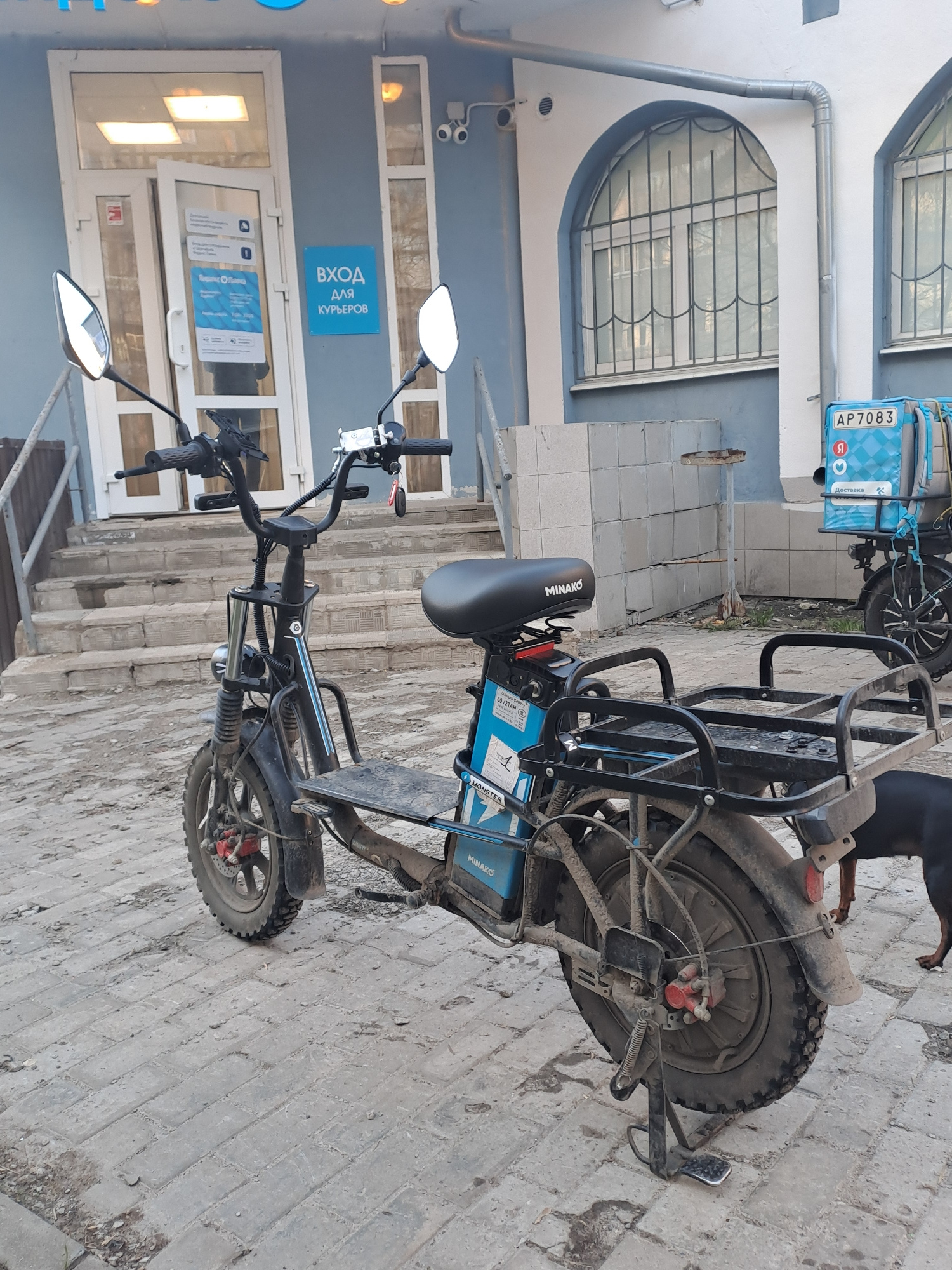 The image shows an electric bicycle parked on a brick sidewalk in front of a building in Elektrostal, Russia. The bicycle is black and blue and has a rear cargo rack. A delivery box with the license p…read more
