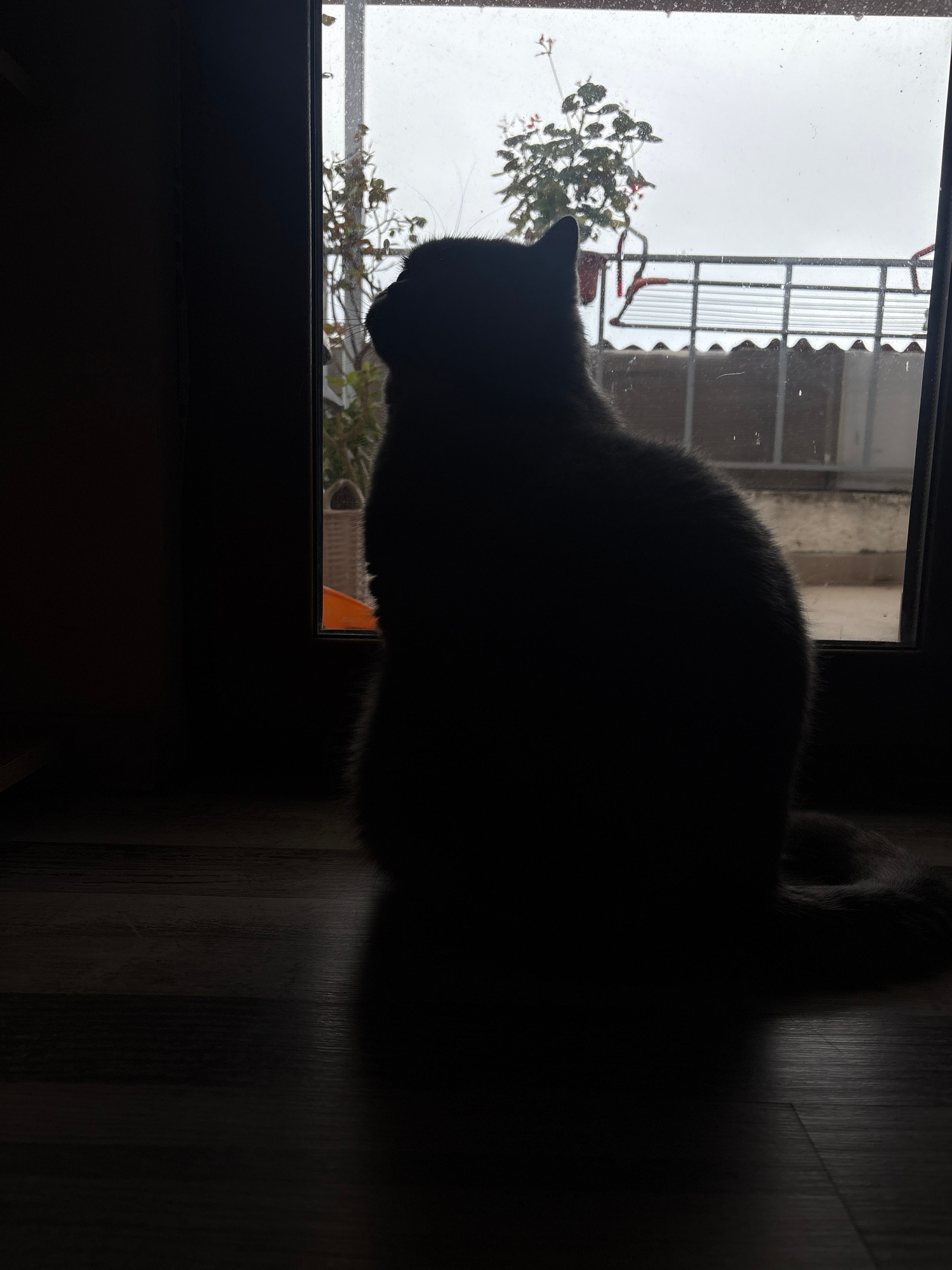 The image shows a cat's silhouette inside a room, looking out of a window. Outside the window, a plant with red berries is visible, as well as part of a metal structure, and a corrugated roof. The ima…read more