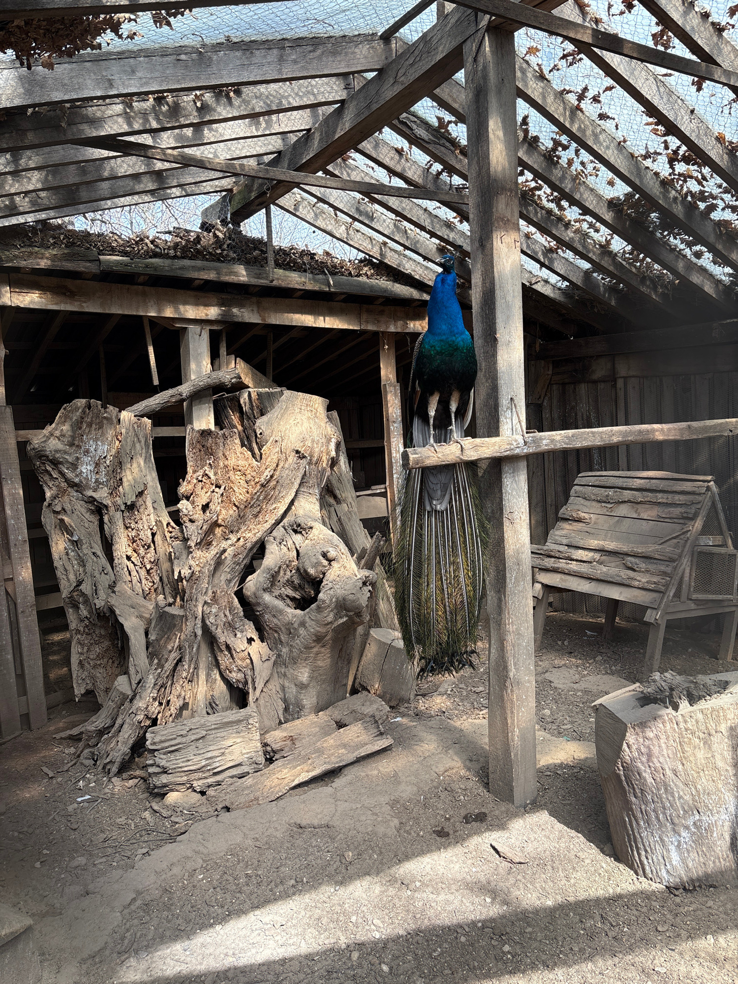 A vibrant peacock stands on a wooden beam inside a dilapidated structure. The structure appears to be a barn or shed, with a skeletal roof frame covered in decaying leaves and debris. Below the peacoc…read more