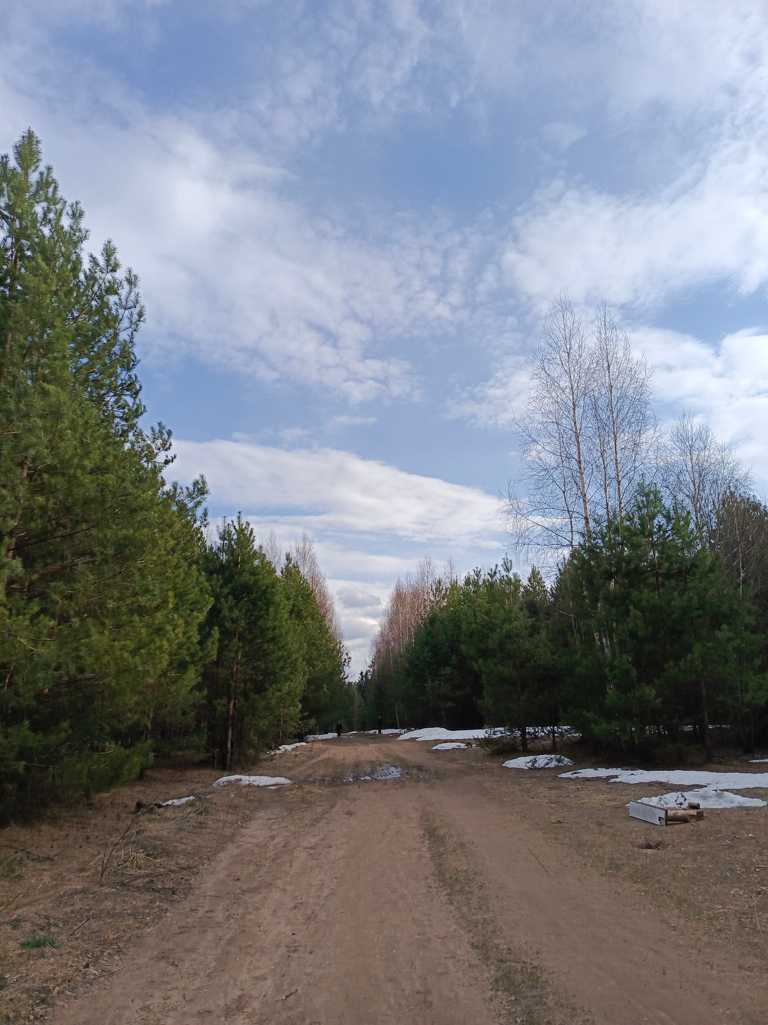 The image depicts a dirt road leading through a wooded area under a partly cloudy sky. The location is Chaikovsky, Russia. The ground is covered with dry grass and patches of melting snow. Trees line…read more