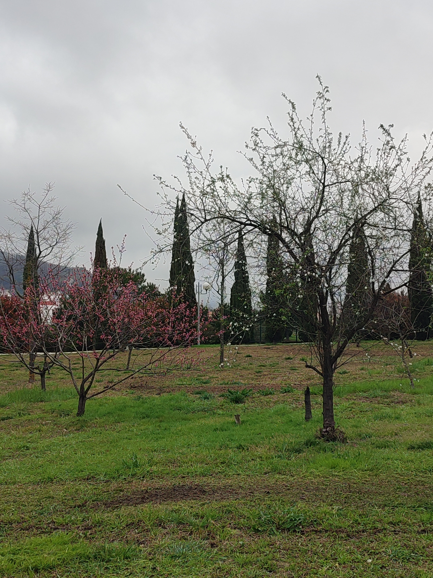 The scene depicts a park in Sirius, Russia, on an overcast day. In the foreground is a field of green grass with patches of brown earth. Several small trees are scattered across the field. One tree is…read more