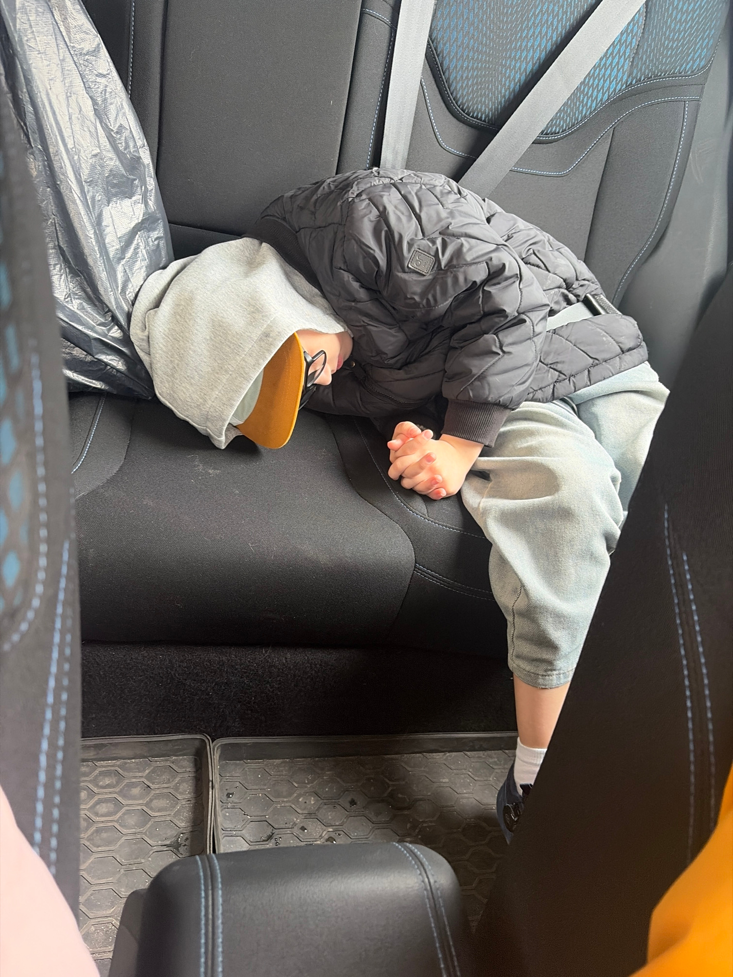 A child is lying down in the back seat of a car. The child is wearing a grey hooded sweatshirt, a black puffy jacket, and light-colored pants. The child is wearing a yellow and black baseball cap. Theβ¦read more