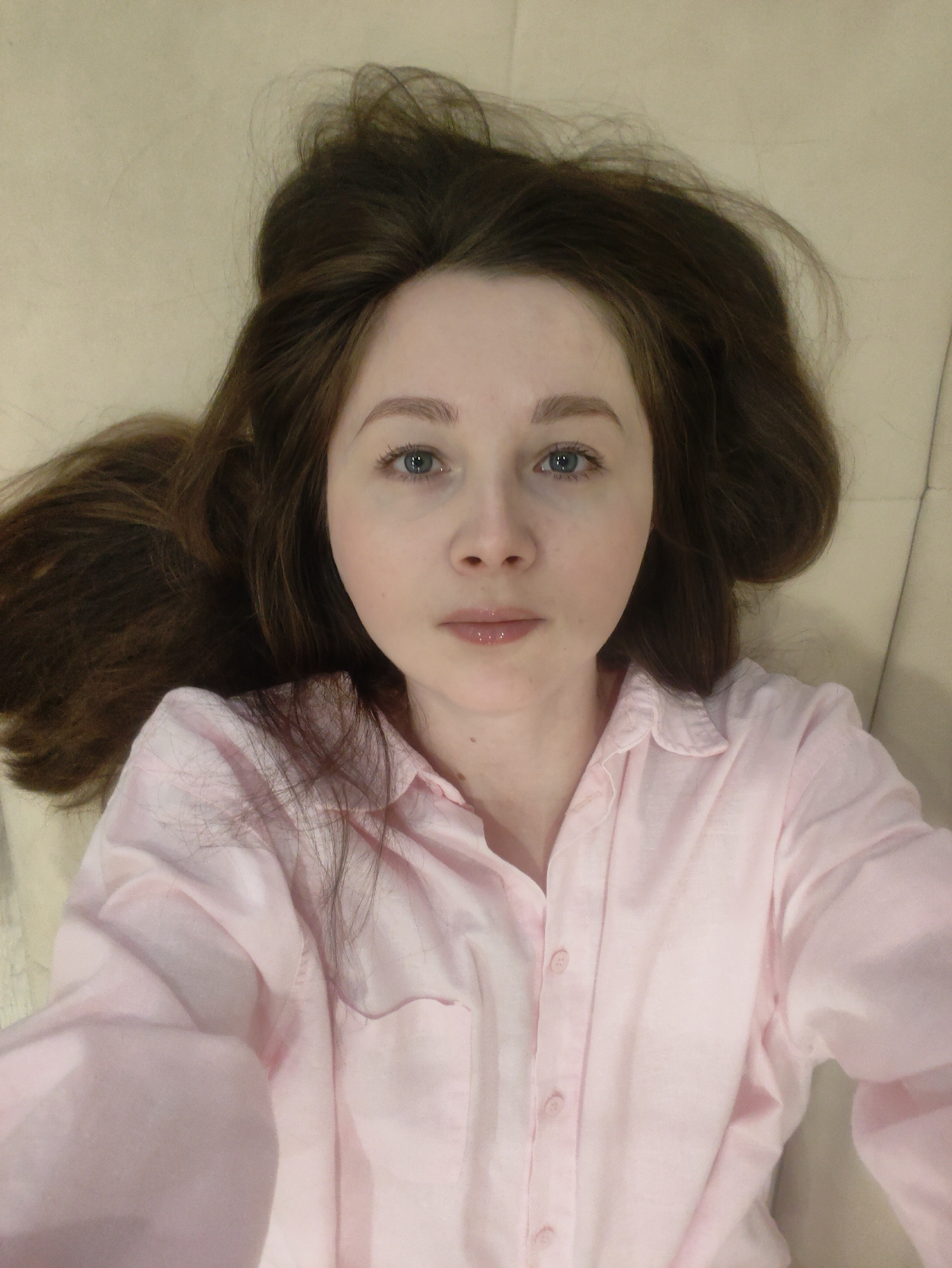 A fair-skinned woman with blue eyes and light brown hair is lying on a light-colored surface, possibly a couch or bed. Her hair is spread around her head. She is wearing a light pink button-down shirt…read more