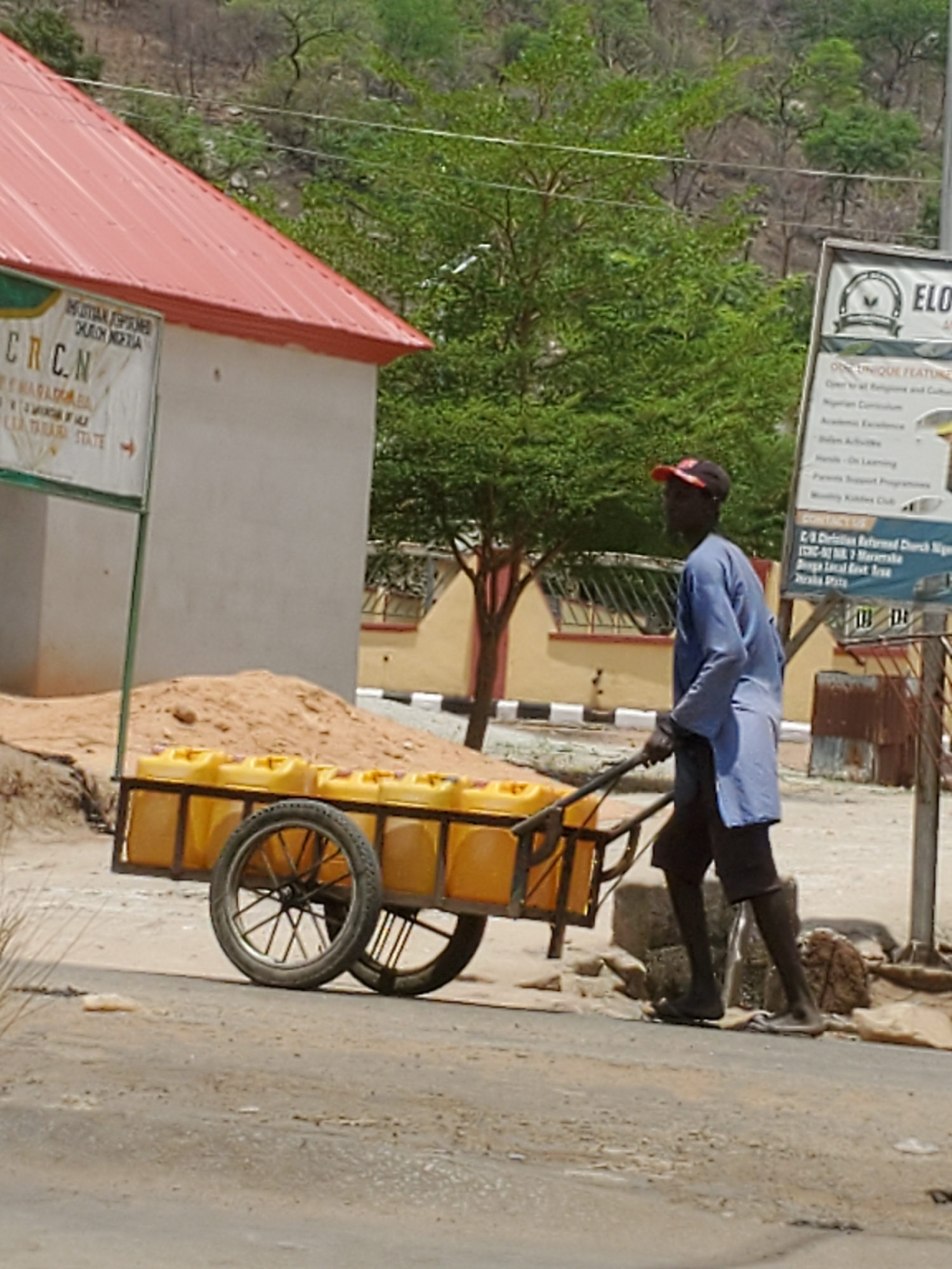 A man wearing a blue tunic and a cap is pulling a cart filled with yellow plastic containers, likely water jugs, on a paved street in Mararaba, Nigeria. The cart has two wheels. A building with a red…read more