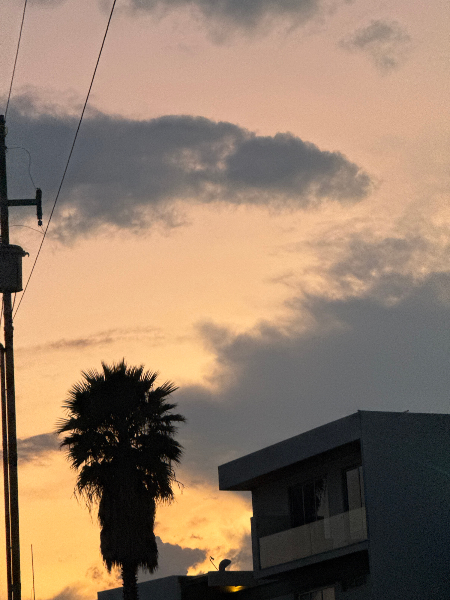 A low-angle shot of a cityscape at dusk, possibly in San Bernardino Tlaxcalancingo, Mexico, reveals a pale orange and grey sky filled with heavy clouds. A palm tree, silhouetted against the sky, stand…read more