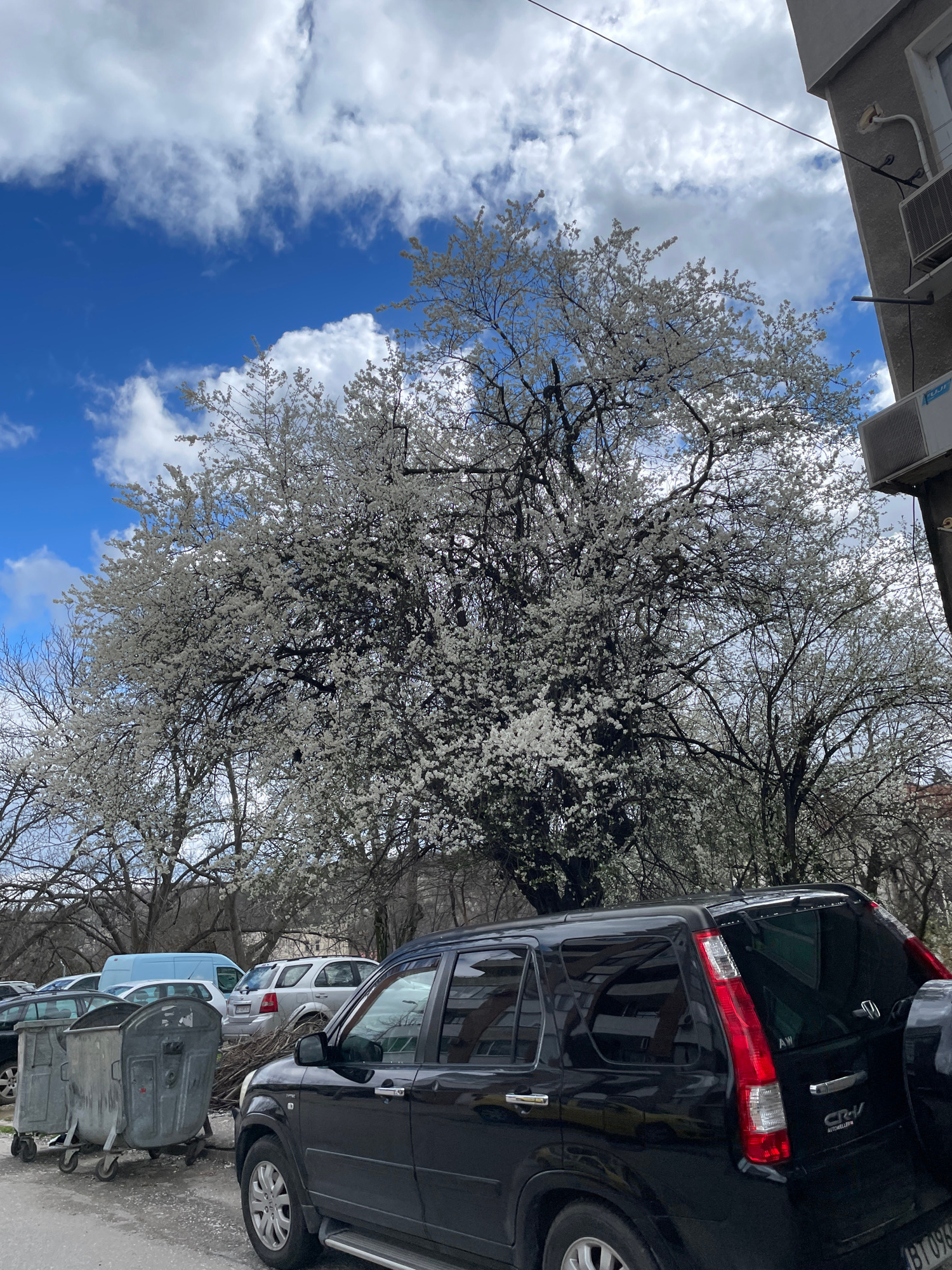 The image depicts a street scene in Veliko Tarnovo, Bulgaria. A flowering tree with white blossoms dominates the view, partially obscuring a blue sky with scattered white clouds. Parked along the stre…read more