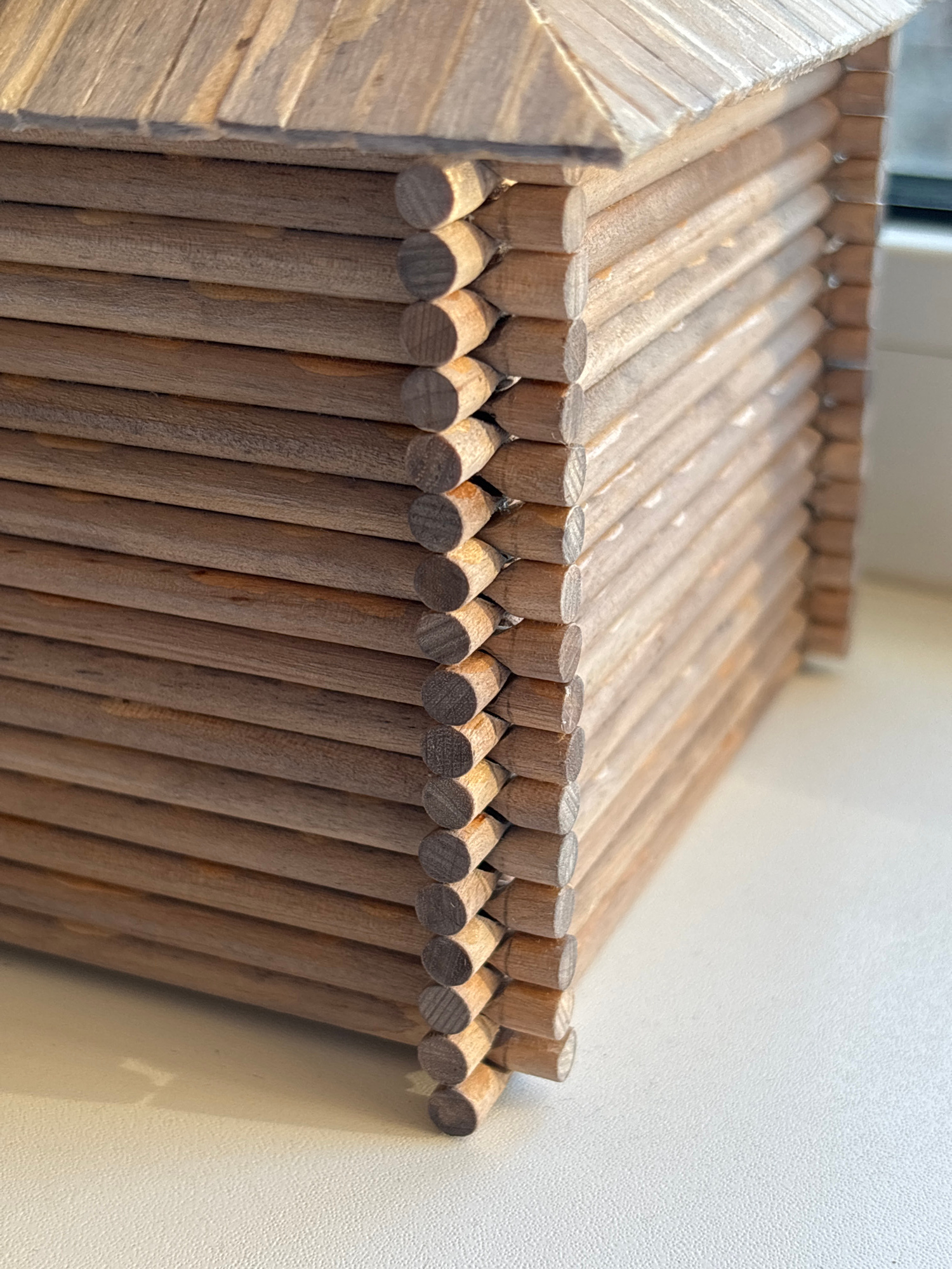The image shows a close-up of a wooden structure, possibly a piece of furniture like a side table or storage unit, constructed from numerous dowels arranged in a parallel, repeating pattern. The dowel…read more