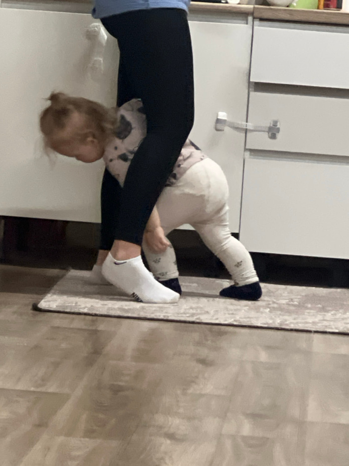 A woman in black leggings and white Nike socks is lying on her back. A child in white leggings and socks lies partially on the woman's torso. The child is facing away from the camera. The scene is ind…read more