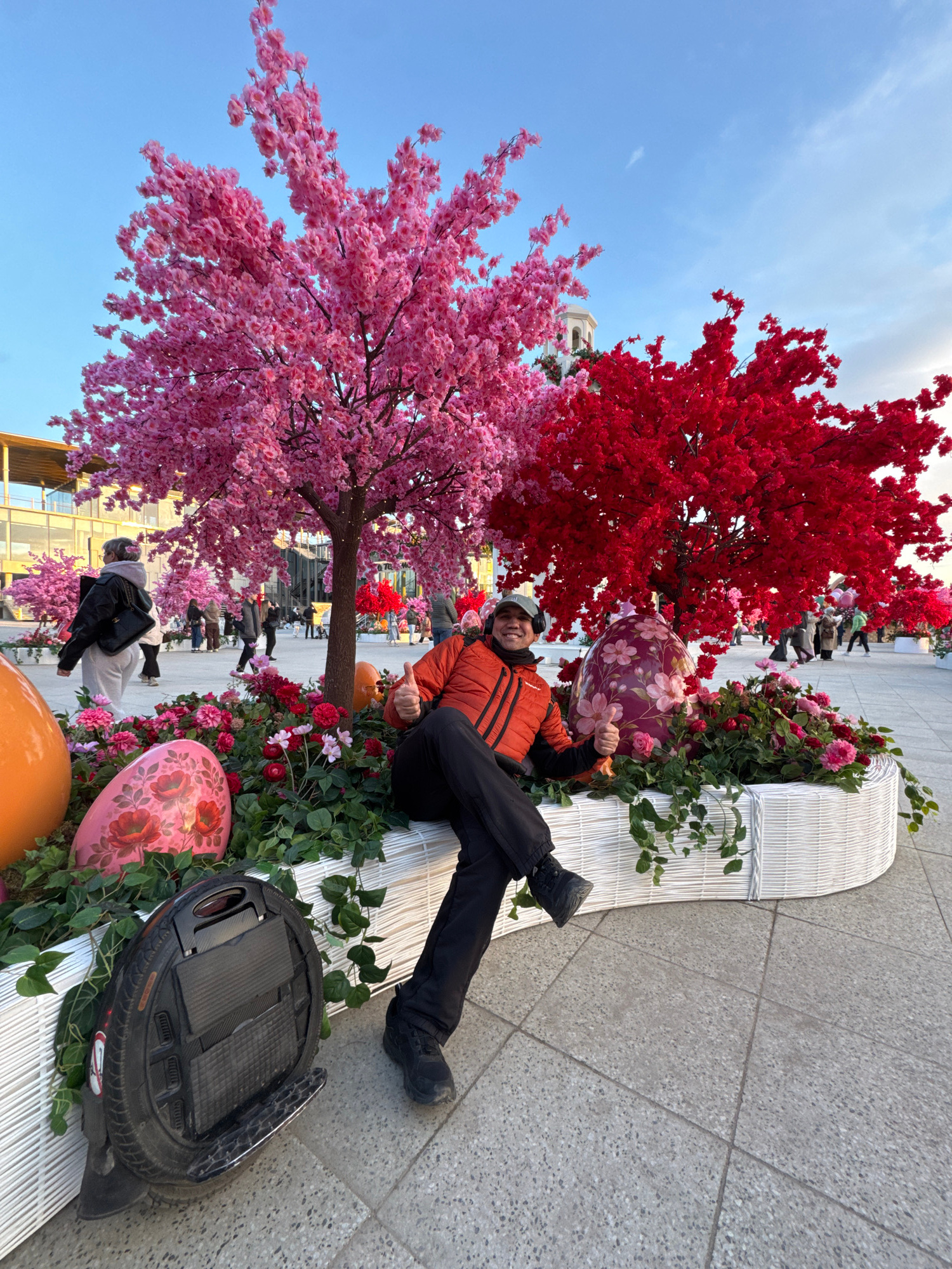 The image depicts a man lying on a white wicker structure decorated with flowers and foliage in what appears to be a public space. The man is wearing an orange jacket, black pants, and a hat. He is gi…read more