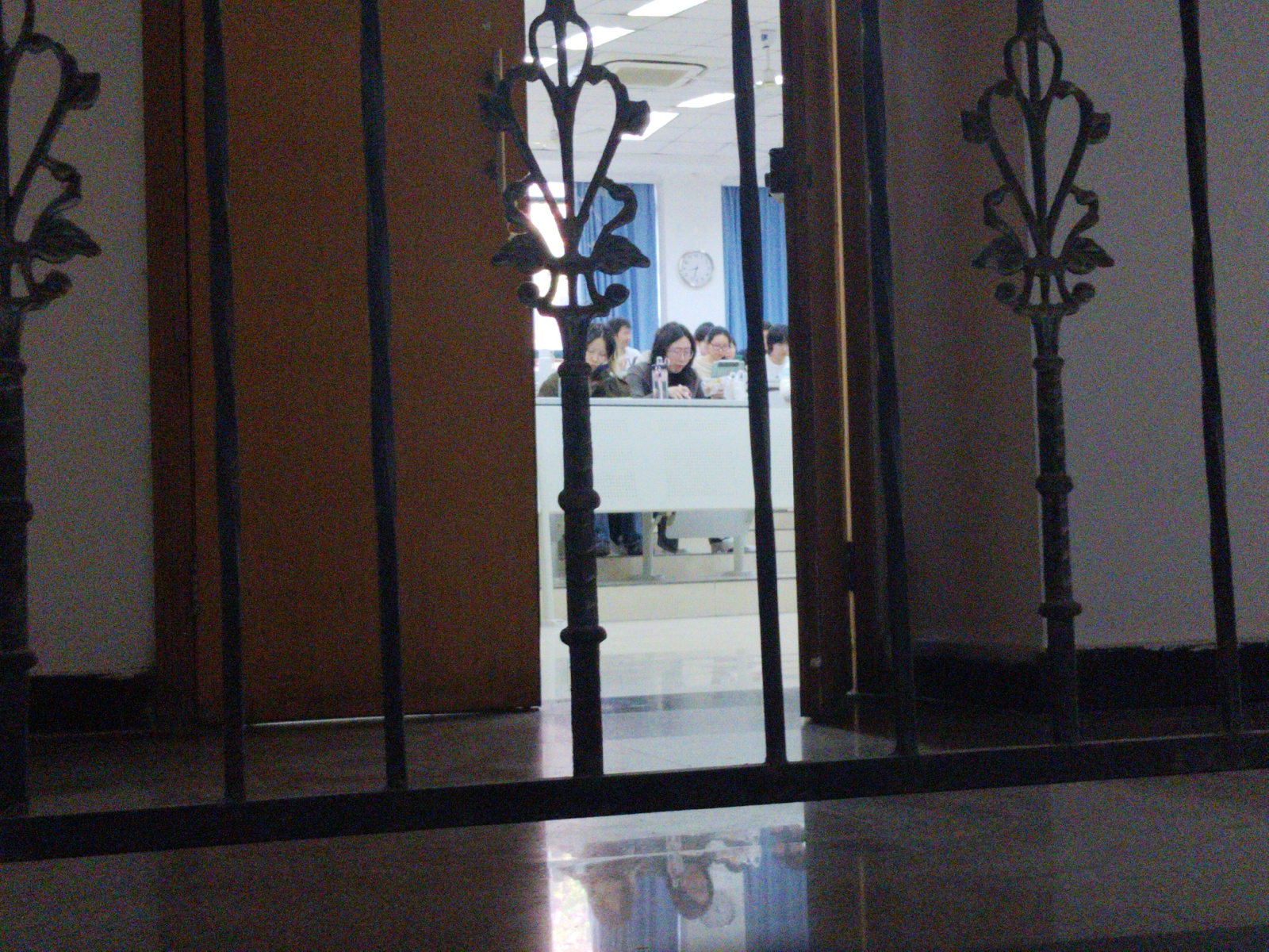 The photograph shows a group of people sitting at a table in what appears to be an office or classroom, viewed through an ornate wrought iron gate or railing. The room has blue curtains and a clock on…read more