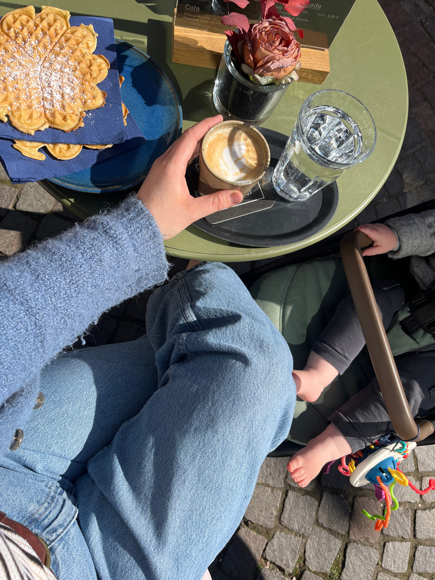 The image depicts a scene at an outdoor cafe in Meisenheim, Germany. The table is a light green color and holds a glass of water, a cappuccino in a paper cup held by a person wearing a blue sweater an…read more