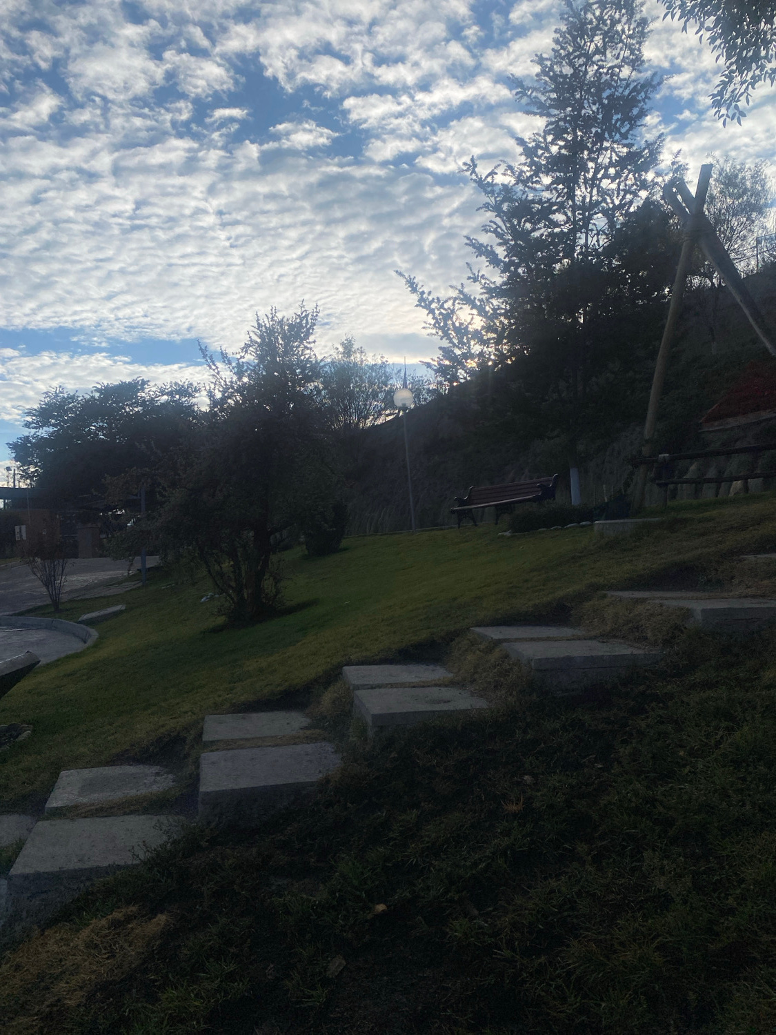 The image captures an outdoor scene, likely a park or landscaped garden, under a bright, cloud-dotted sky. The perspective is slightly angled, looking upwards towards the sky and across a grassy area.…read more