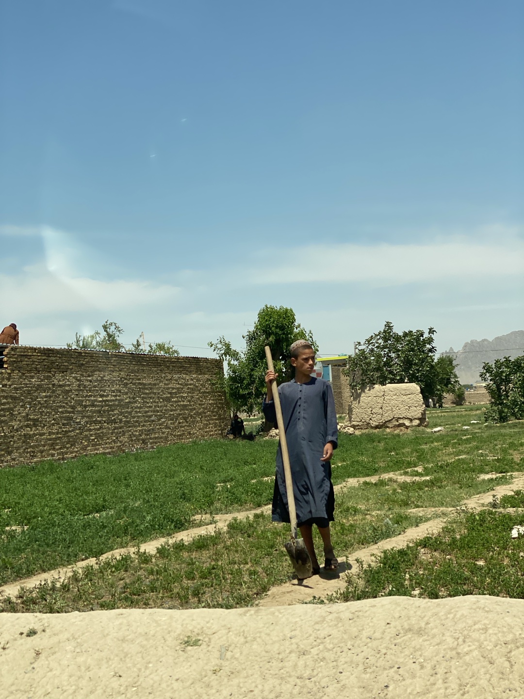 A young man in a dark blue robe stands in a field holding a shovel. He has short dark hair and is looking off to the left. Behind him is a low brick wall, green vegetation, trees, and a small stone st…read more