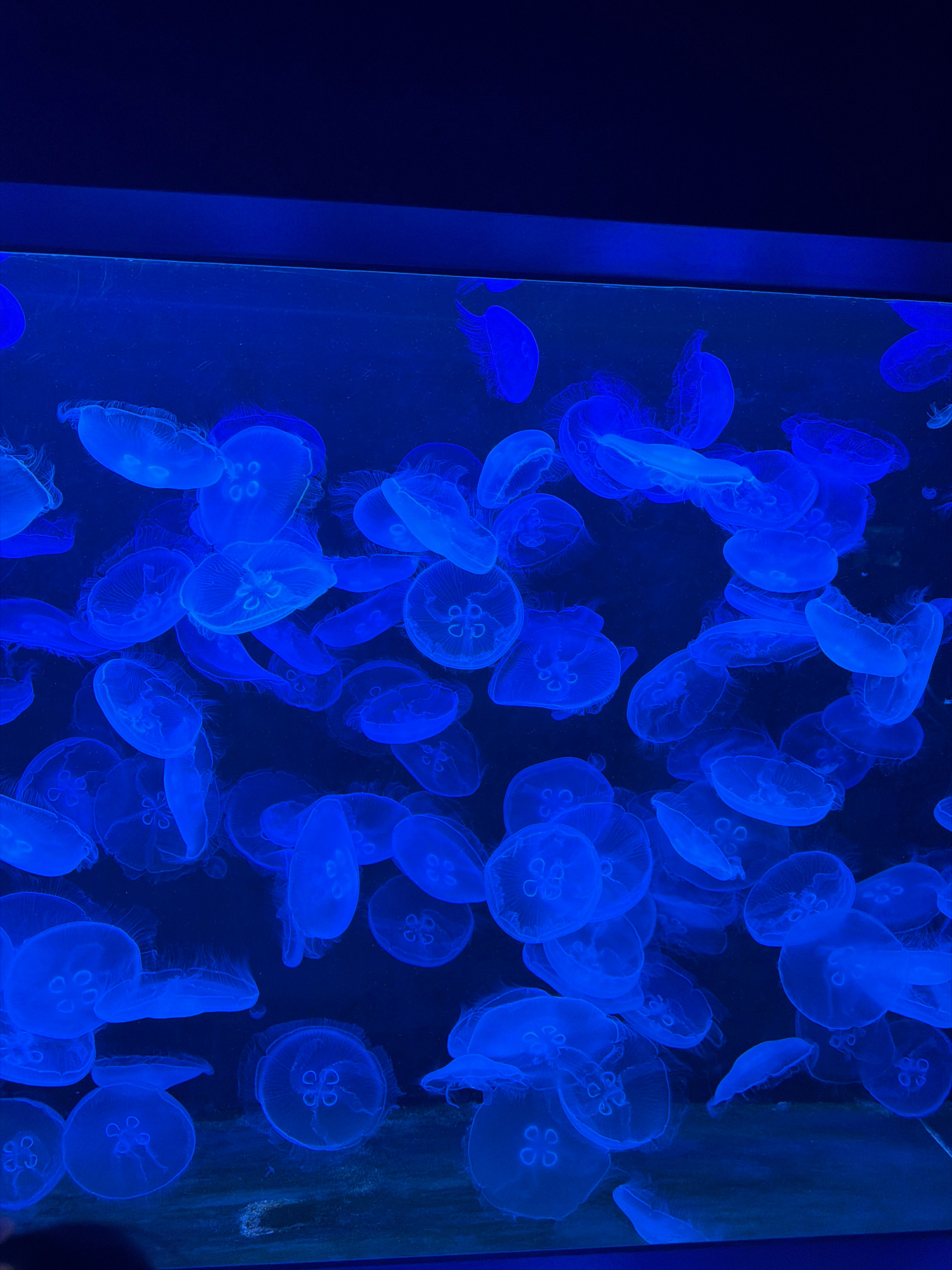 The image depicts a large group of jellyfish in a tank, illuminated with blue light. The jellyfish are the dominant subject, appearing translucent with visible internal structures. The tank itself isβ¦read more