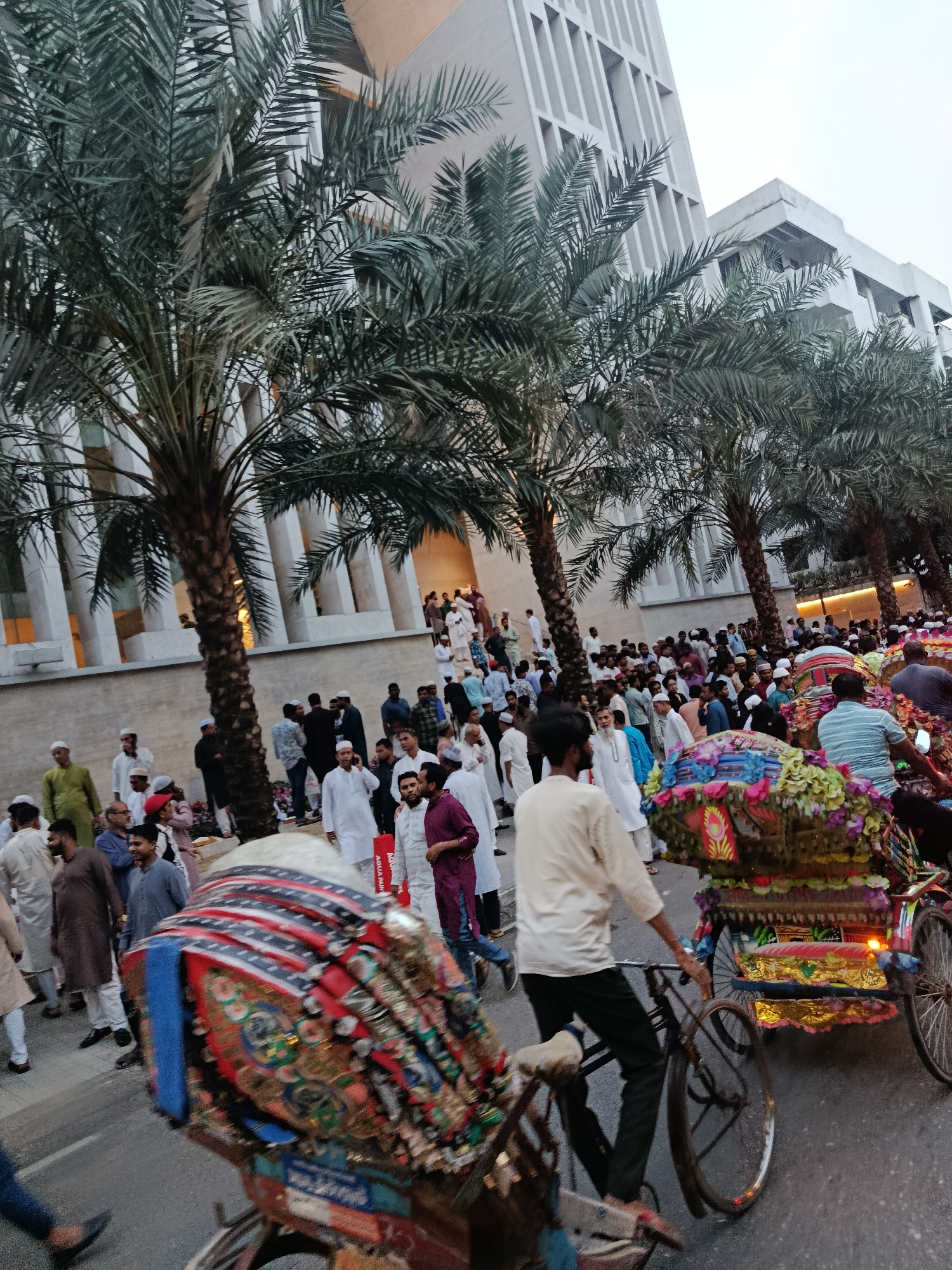 The image depicts a crowded street scene in Dhaka, Bangladesh, likely during a religious or cultural event. A large group of men, many wearing traditional Islamic attire such as thobes and caps, are gā¦read more