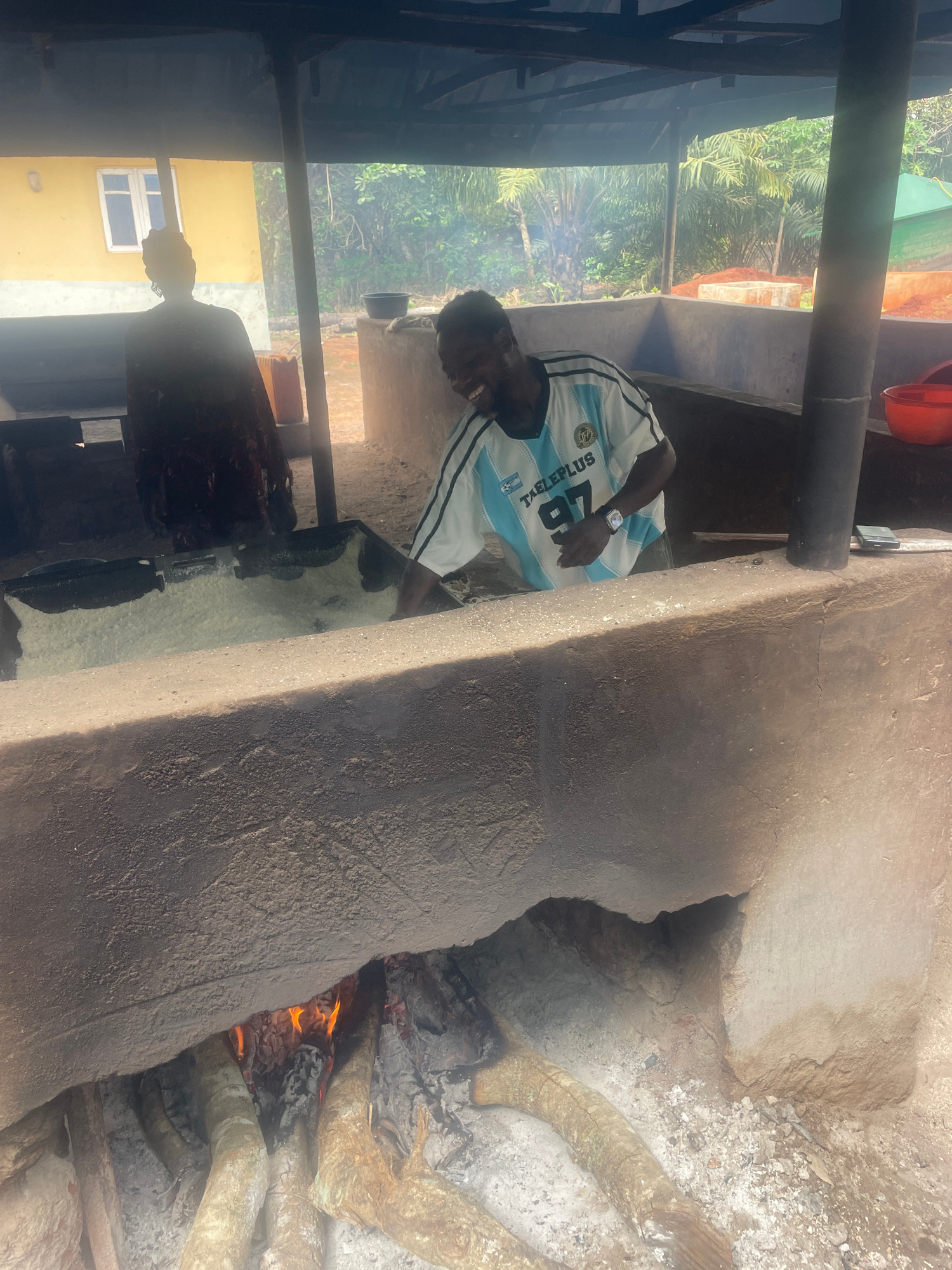 A man wearing a white and light blue soccer jersey with the number "97" on it stands next to a large outdoor stove in Eke, Nigeria. The stove is constructed of concrete and appears to have a fire burn…read more