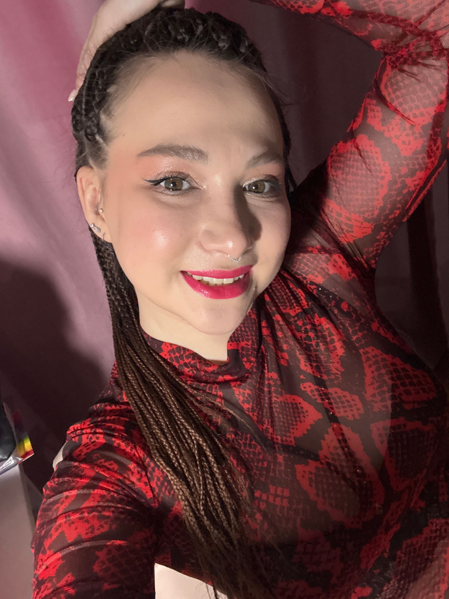 A young woman lies on a pink surface, angled toward the viewer. She has fair skin, light brown eyes, and dark brown hair styled in braids. She is wearing red lipstick and has a silver nose ring and mu…read more